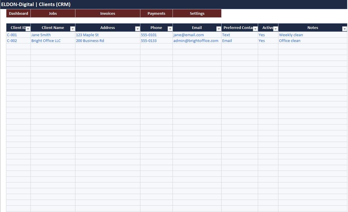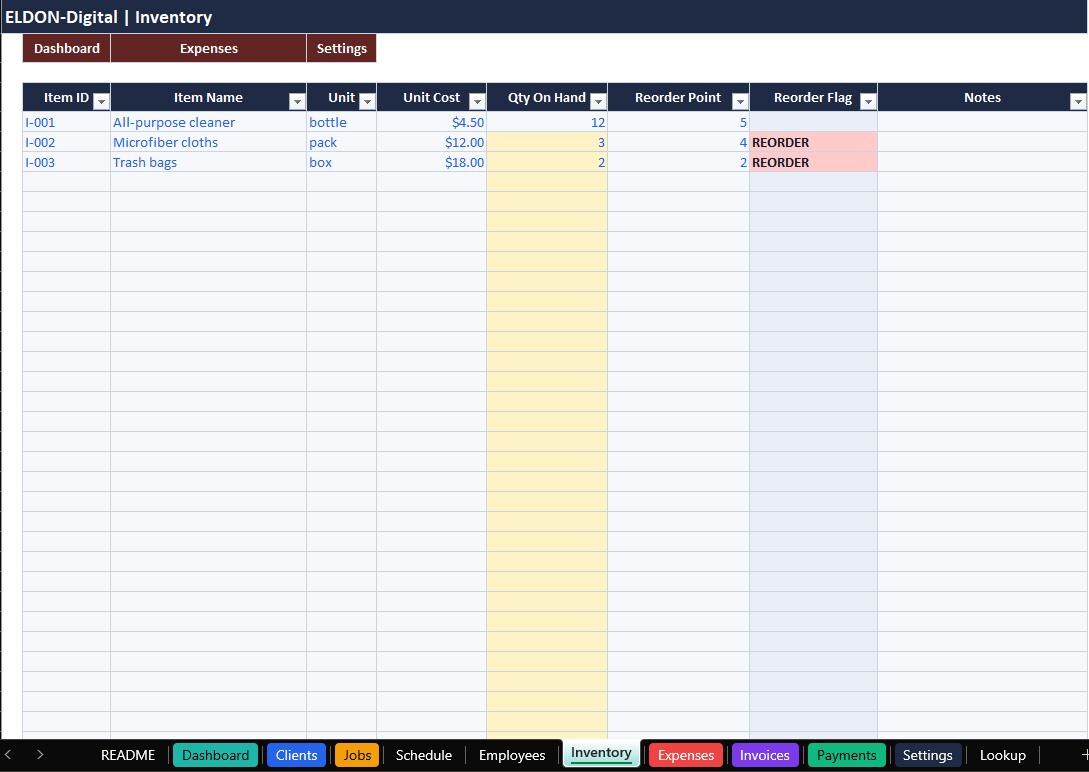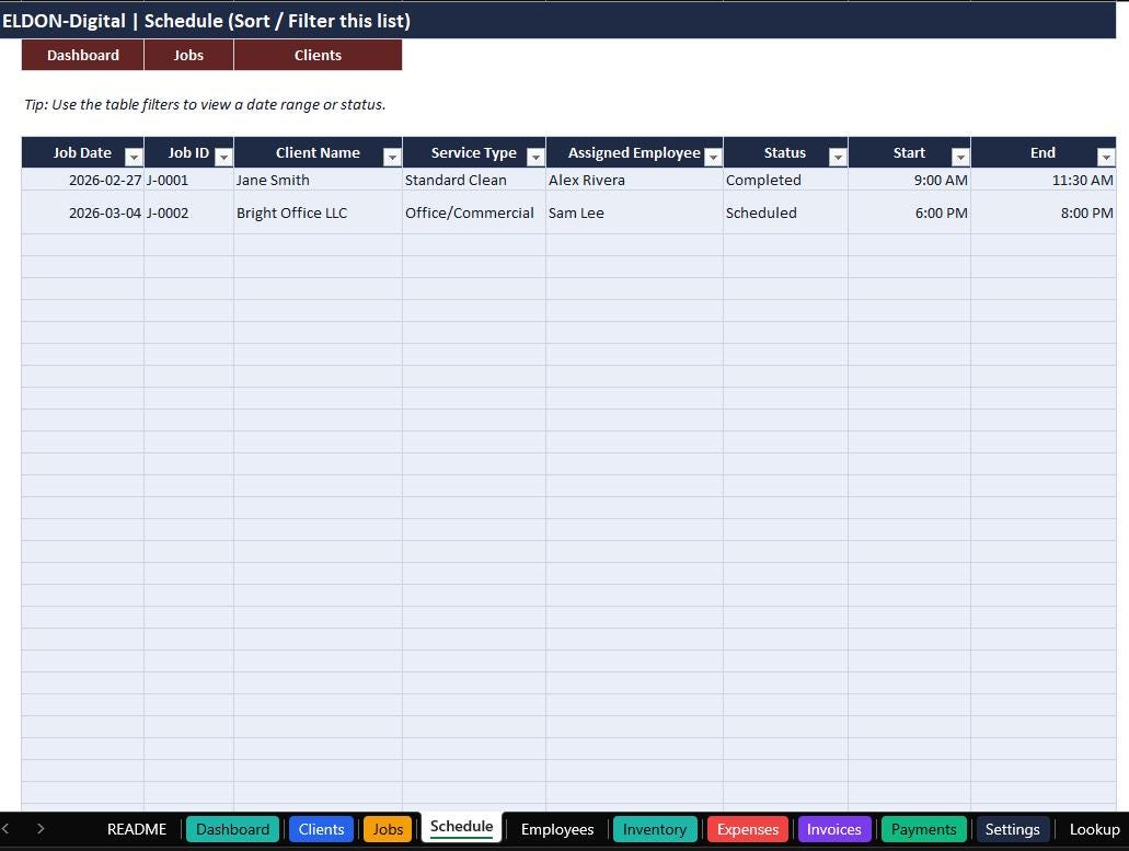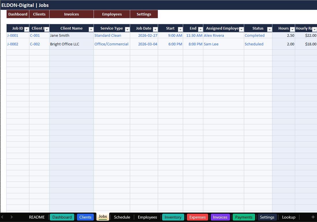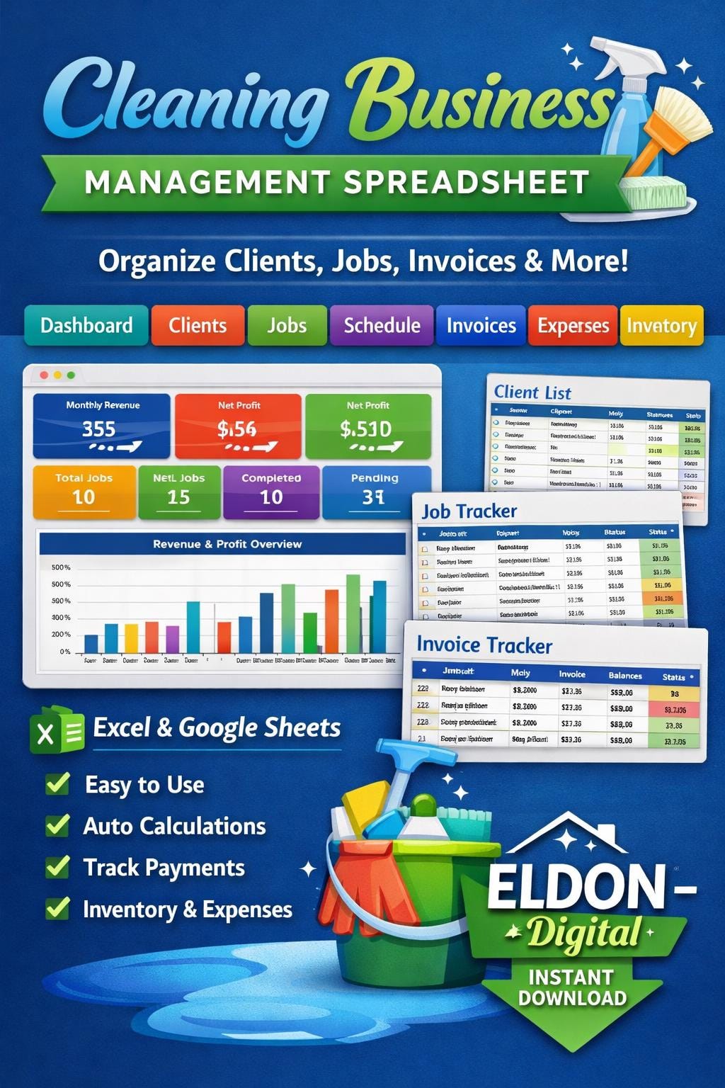 Run your cleaning business like a pro with this all-in-one Cleaning Business Management Spreadsheet by ELDON-Digital. Track clients, jobs, schedules, invoices, payments, expenses, inventory, and profit in one organized, colorful workbook with easy navigation buttons.