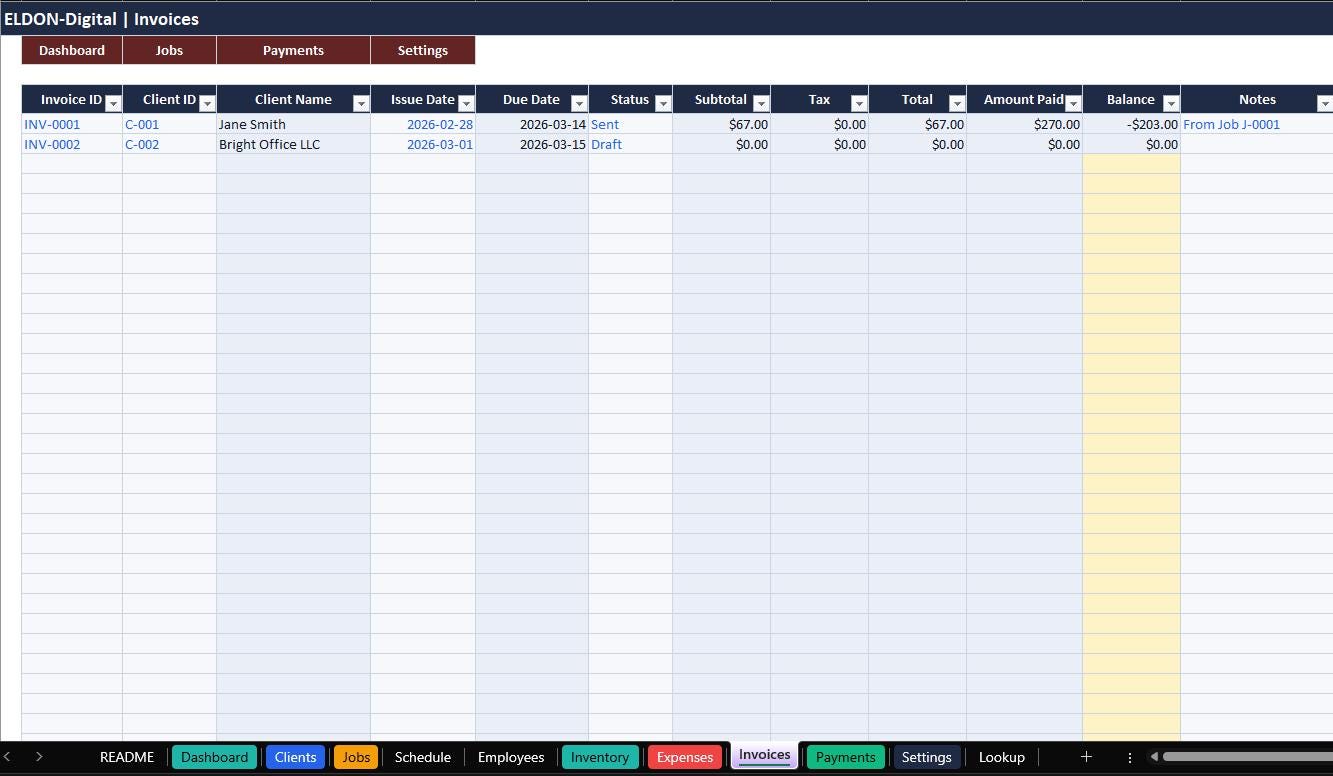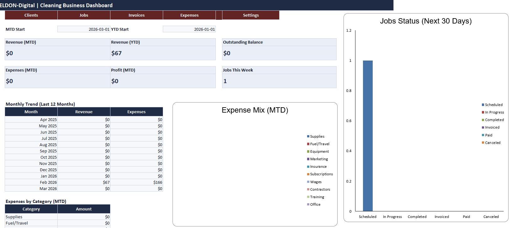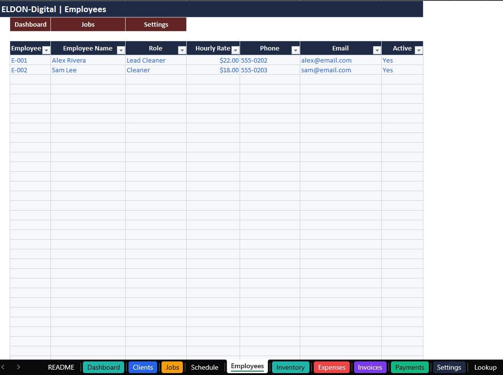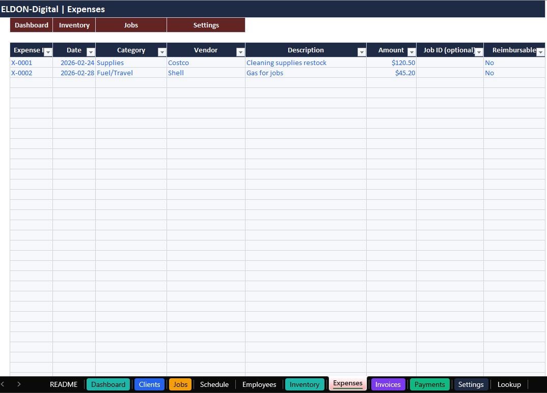Run your cleaning business like a pro with this all-in-one Cleaning Business Management Spreadsheet by ELDON-Digital. Track clients, jobs, schedules, invoices, payments, expenses, inventory, and profit in one organized, colorful workbook with easy navigation buttons.
