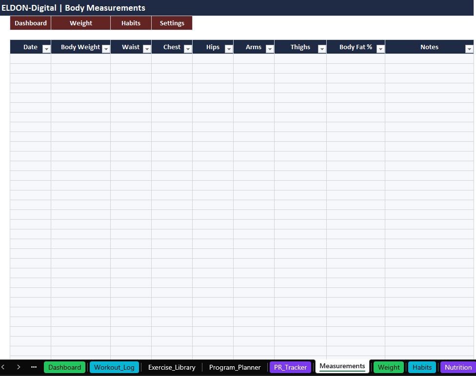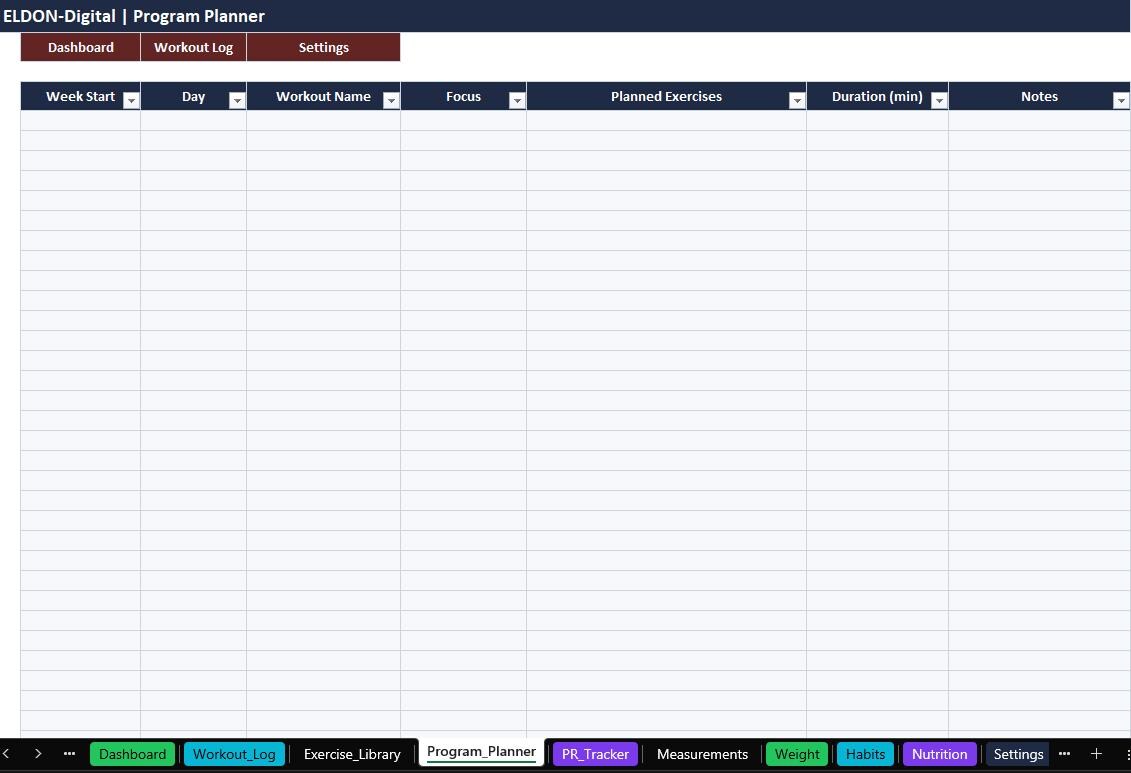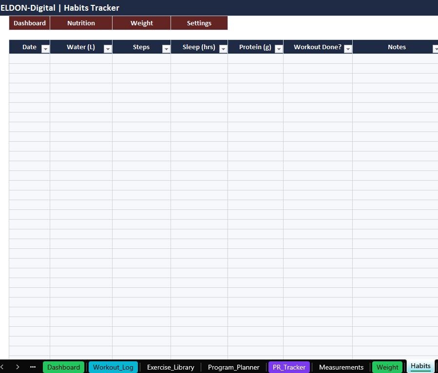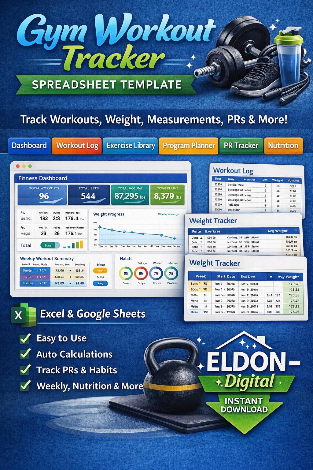 Stay consistent and track real progress with this all-in-one Gym Trackers Spreadsheet Template by ELDON-Digital. Perfect for beginners or advanced lifters, this colorful and organized tracker helps you plan workouts, log sessions, monitor PRs, track weight and measurements, and stay on top of habits and nutrition.