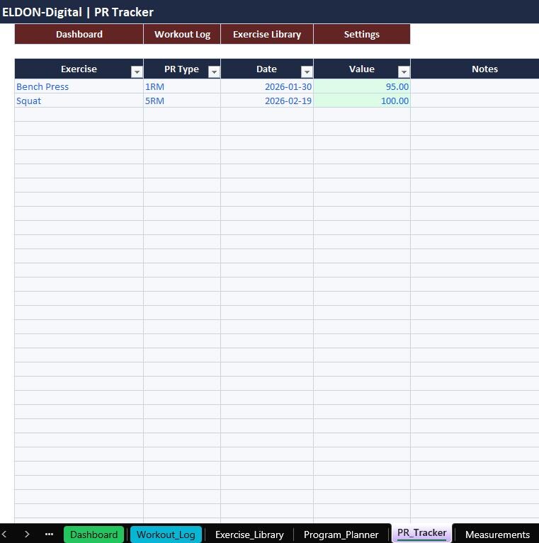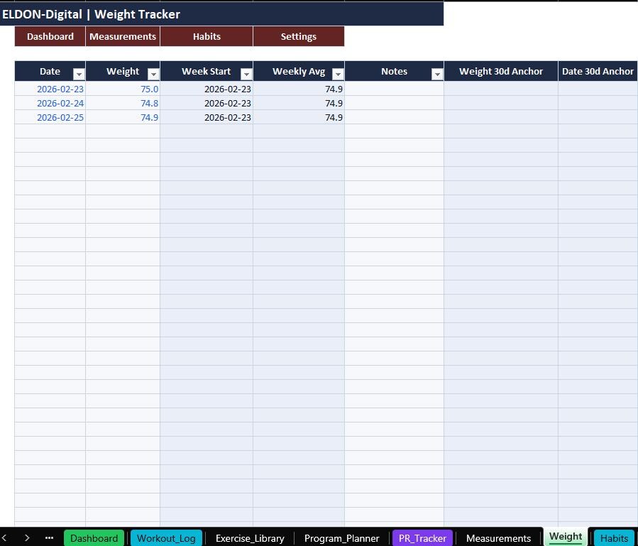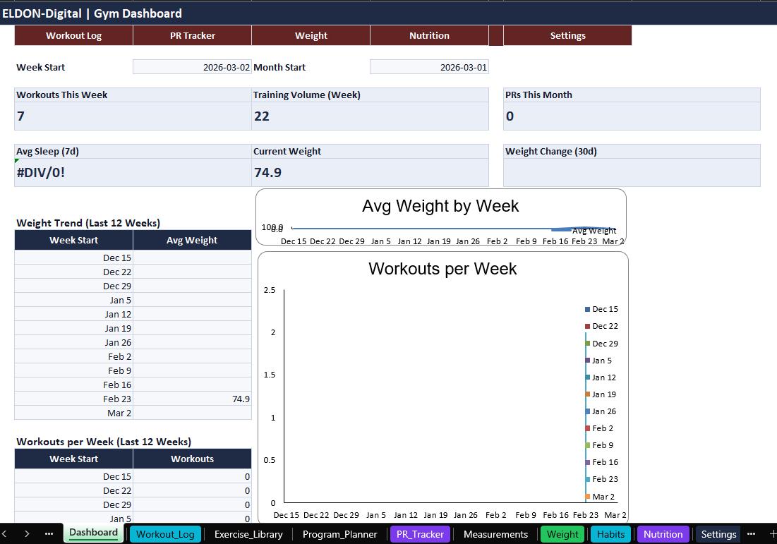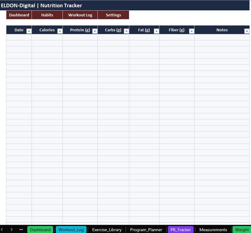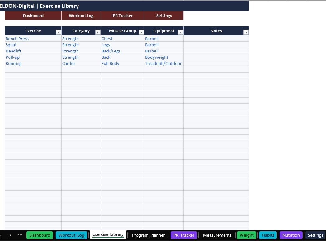 Stay consistent and track real progress with this all-in-one Gym Trackers Spreadsheet Template by ELDON-Digital. Perfect for beginners or advanced lifters, this colorful and organized tracker helps you plan workouts, log sessions, monitor PRs, track weight and measurements, and stay on top of habits and nutrition.