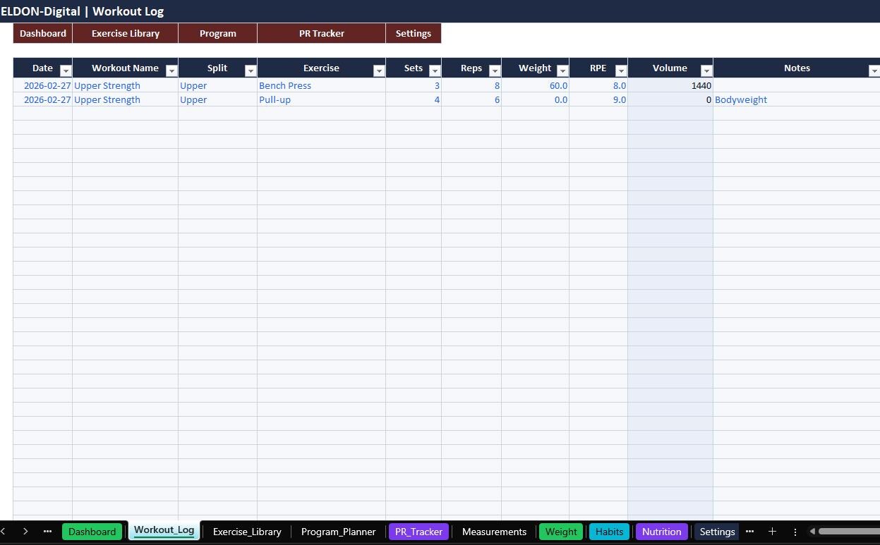• Auto-calculations for totals, weekly summaries, and workout volume