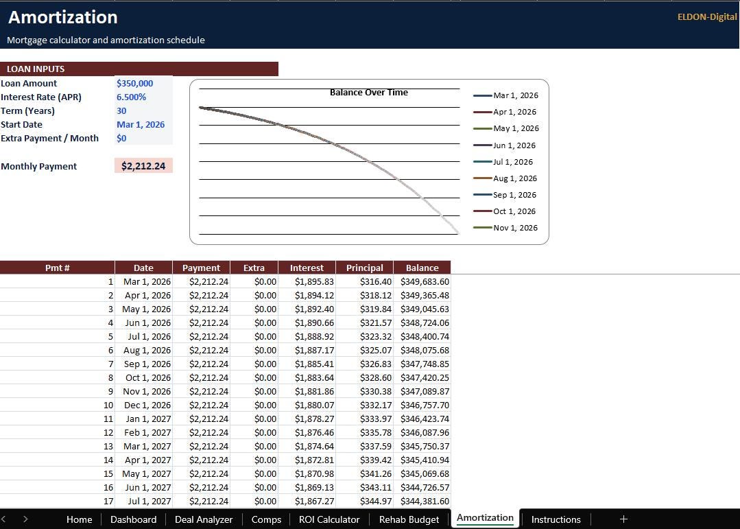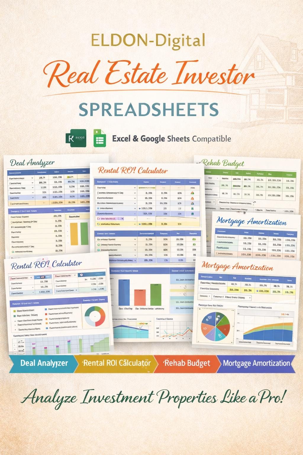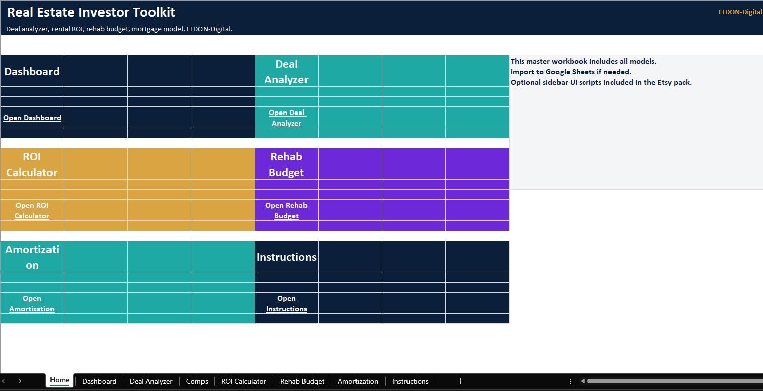 Analyze real estate deals faster and invest with confidence using this complete Real Estate Investor Spreadsheet Toolkit by ELDON-Digital. This organized, colorful set of calculators is built for Excel and can be imported into Google Sheets. Run the numbers on rental properties, estimate rehab costs, compare deals, and view loan payments and amortization, all with clean dashboards and charts.