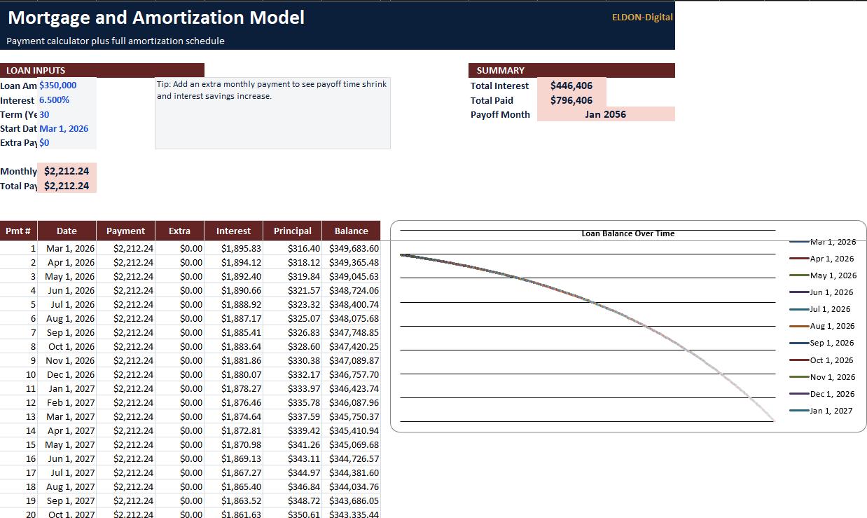 • Full amortization schedule by month