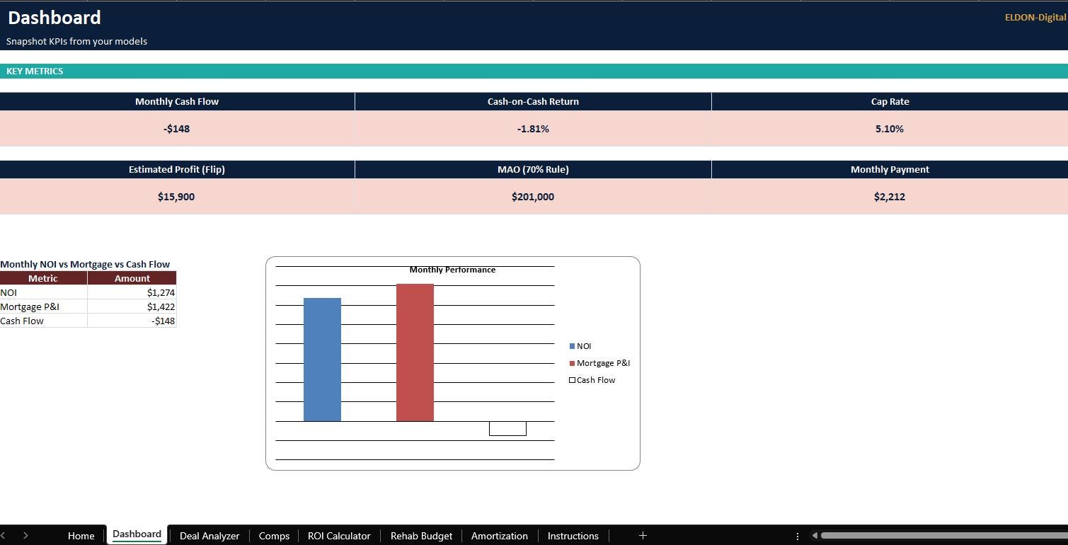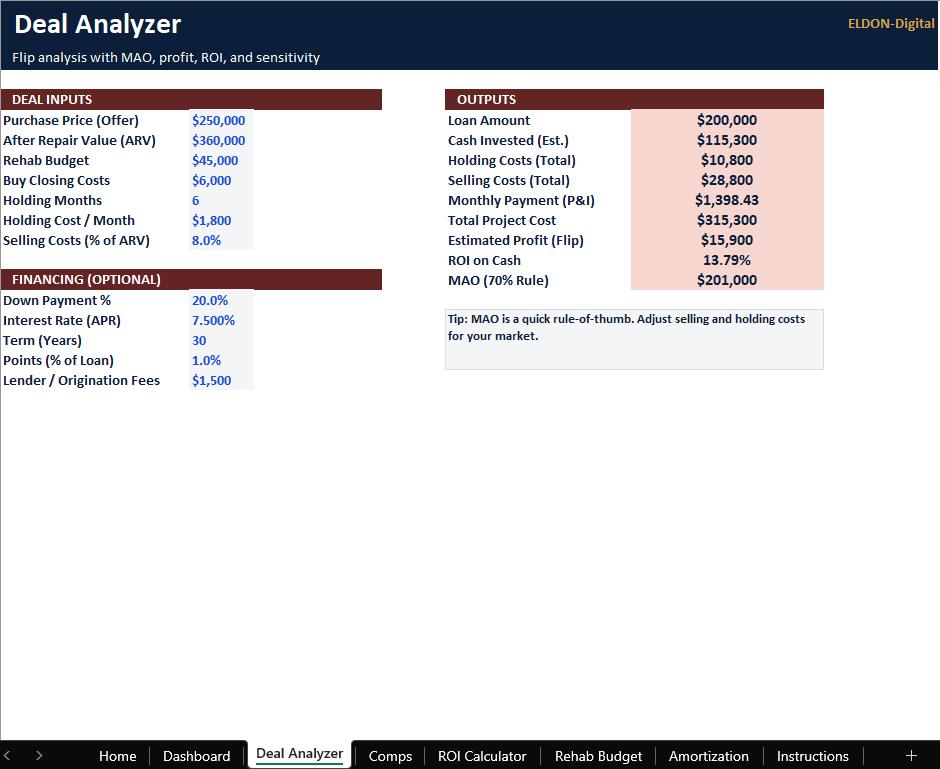 • Separate Excel files for each tool (Deal Analyzer, ROI, Rehab Budget, Mortgage/Amortization)