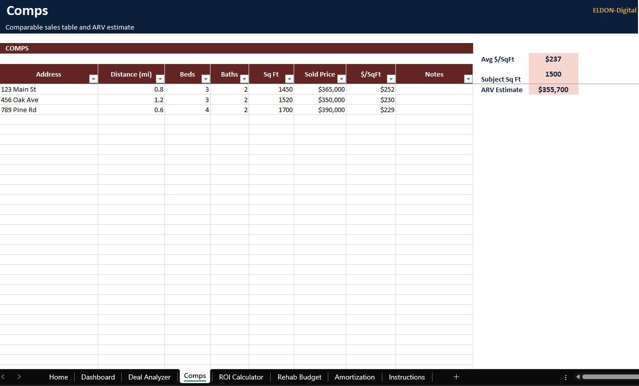 • Comps section to track comparable properties (price, sqft, ARV, notes)