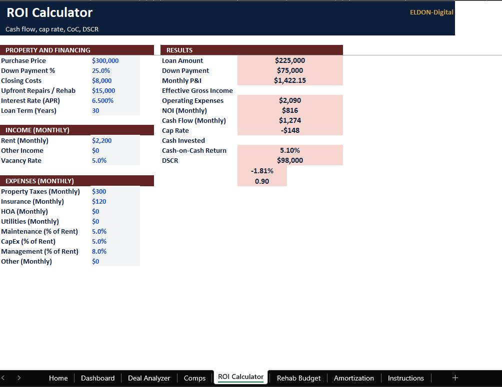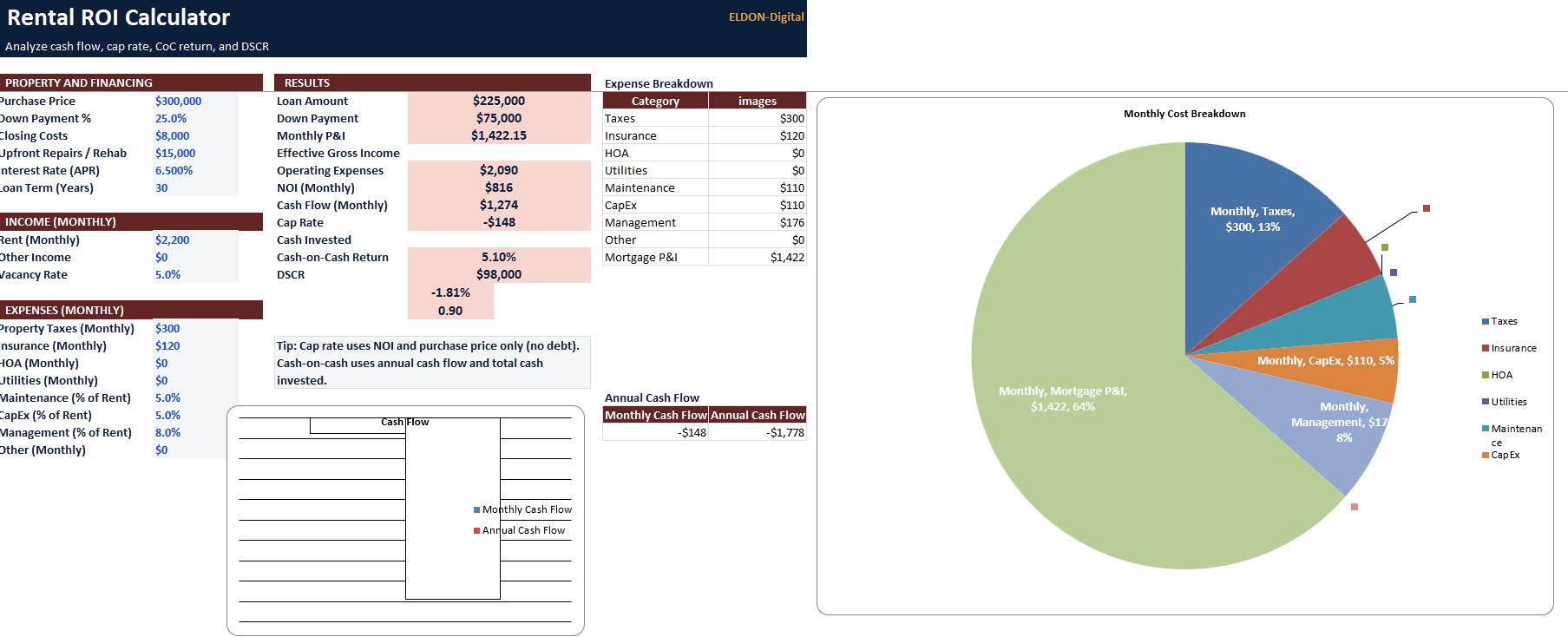 • Auto-calculated net cash flow and key ROI metrics