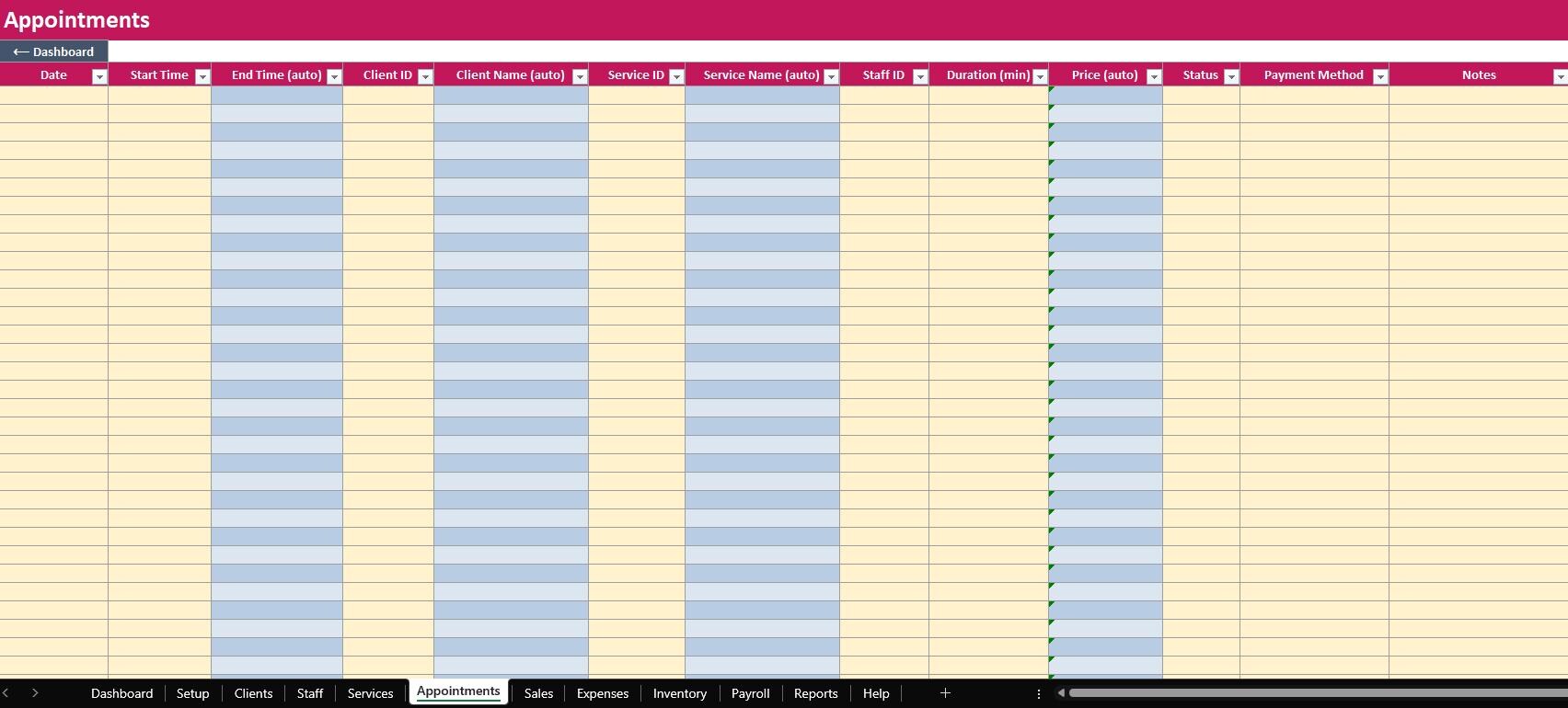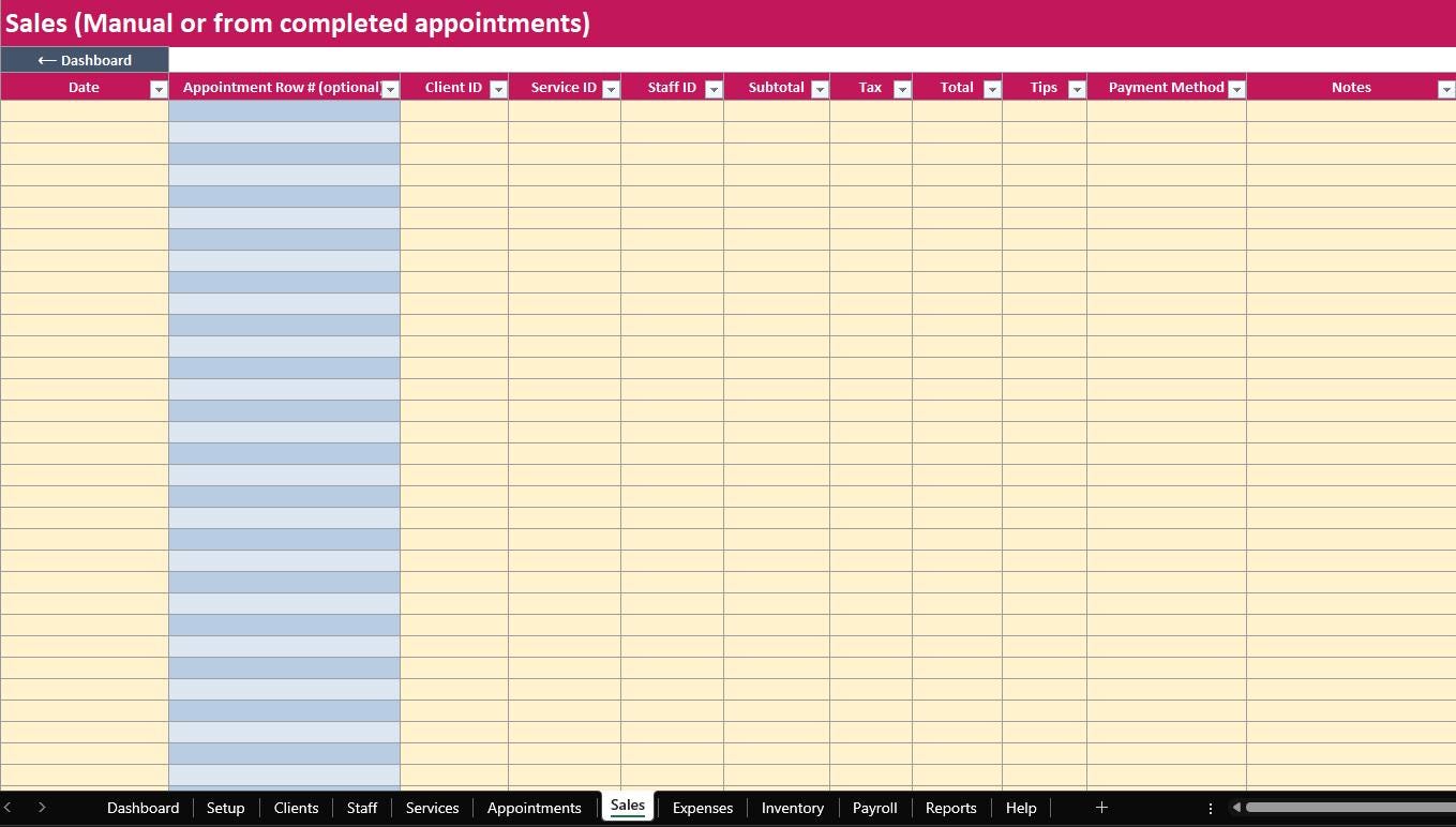 ELDON-Digital Salon Manager, Appointment Book + Client CRM + Sales and Expense Tracker + Inventory + Payroll, Excel and Google Sheets, Instant Download