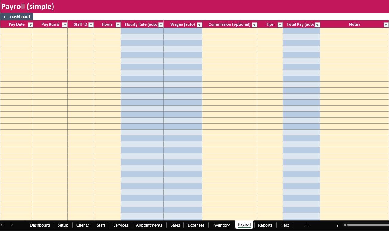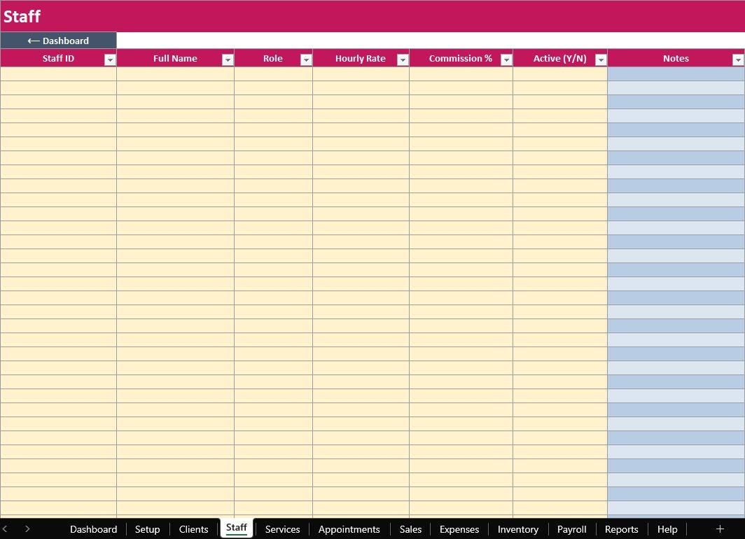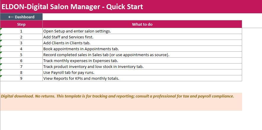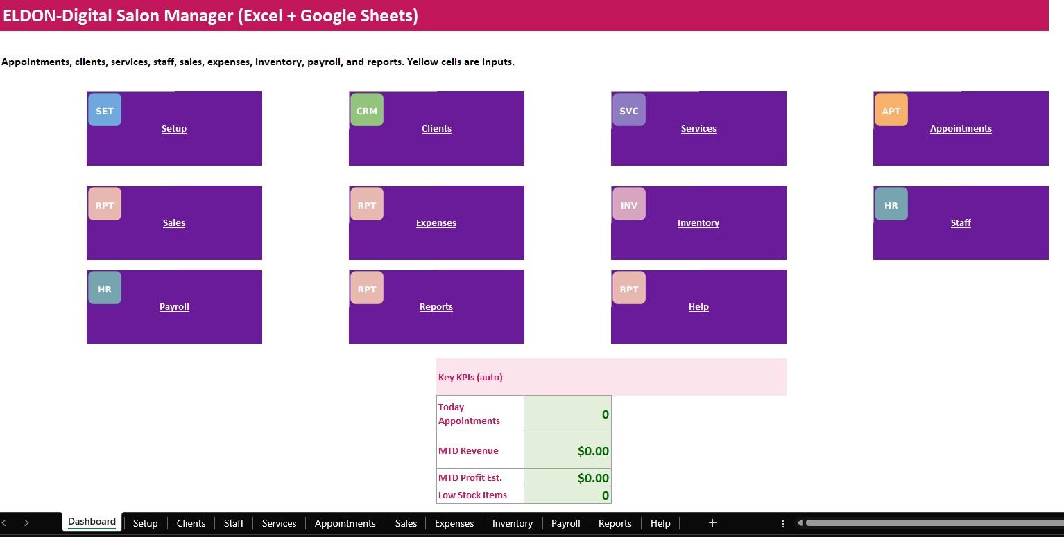 Run your salon in one organized system. The ELDON-Digital Salon Manager is a complete spreadsheet “program” designed to track appointments, clients, services, staff, sales, expenses, inventory, payroll, and reports. It includes a colorful dashboard with navigation buttons, clean tables, and automatic calculations so you can stay on top of daily operations without monthly software fees.