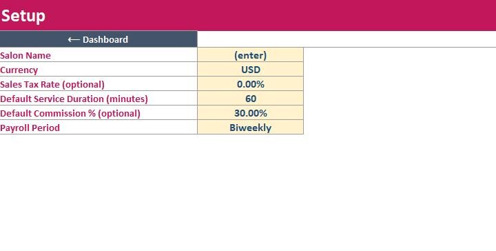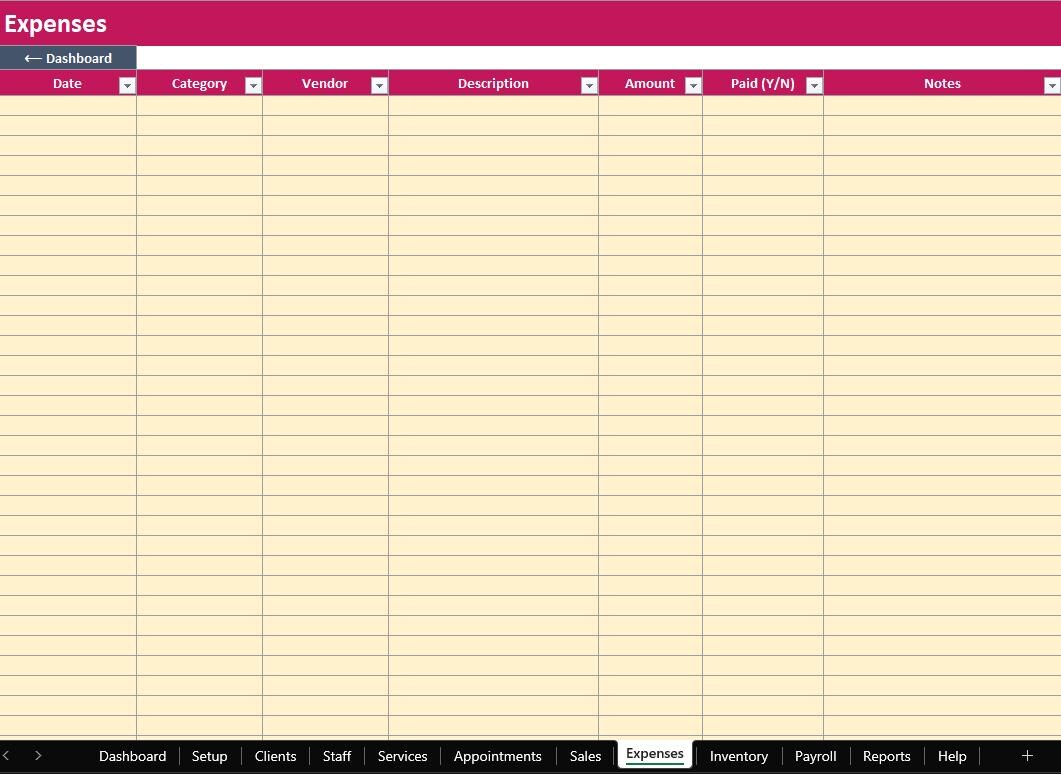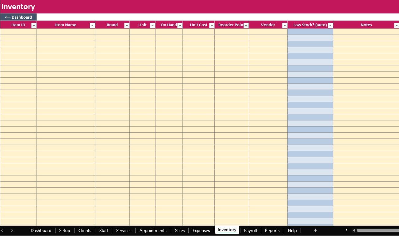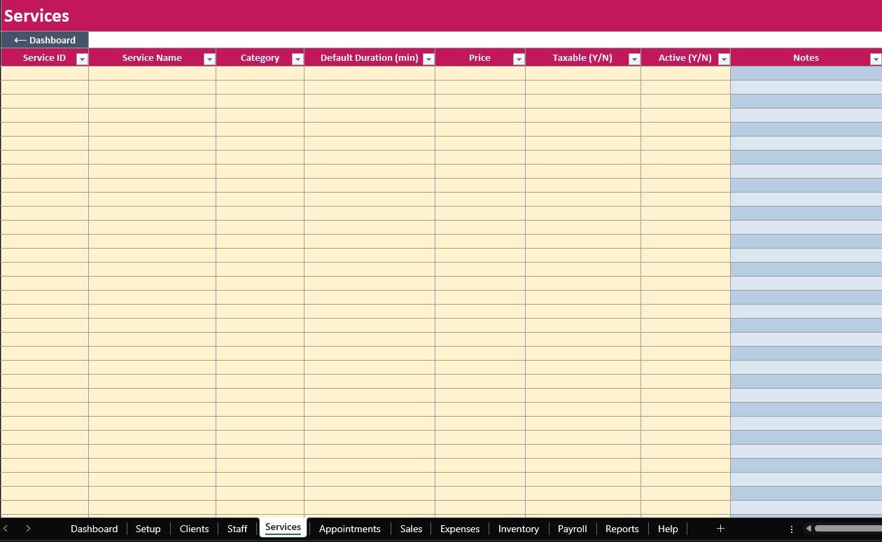 Run your salon in one organized system. The ELDON-Digital Salon Manager is a complete spreadsheet “program” designed to track appointments, clients, services, staff, sales, expenses, inventory, payroll, and reports. It includes a colorful dashboard with navigation buttons, clean tables, and automatic calculations so you can stay on top of daily operations without monthly software fees.