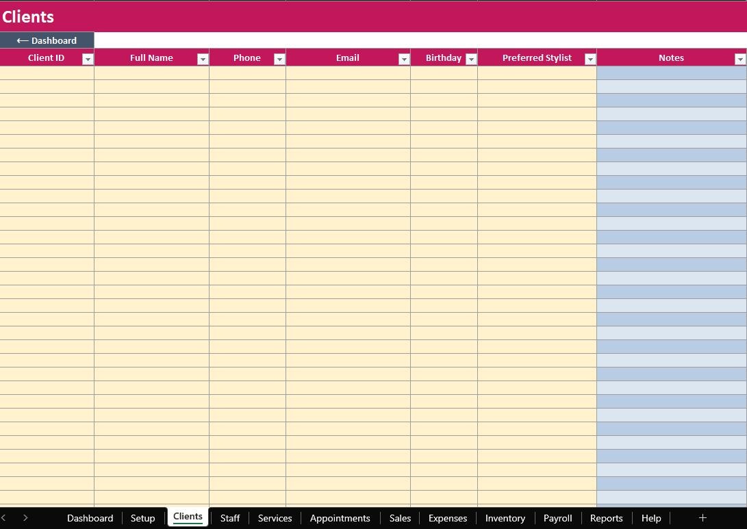 • Client list with contact details, preferred stylist, and notes