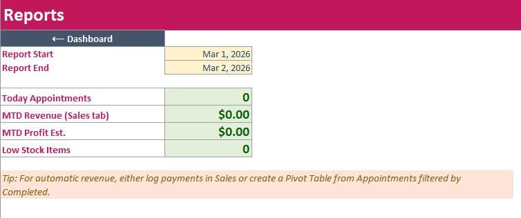 • KPI summary (today appointments, month to date revenue, profit estimate, low stock)