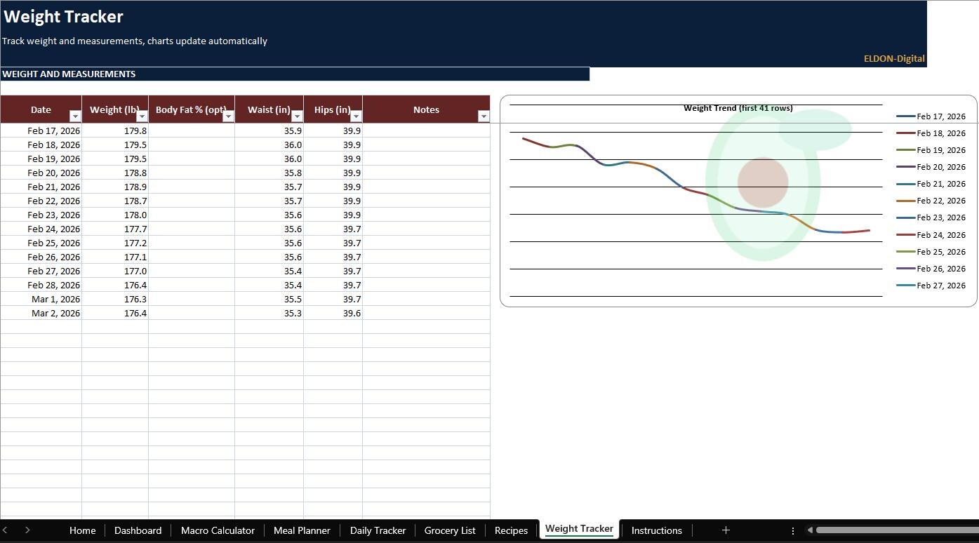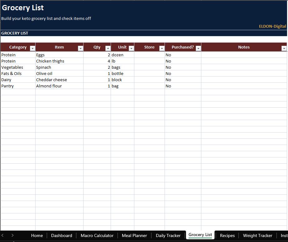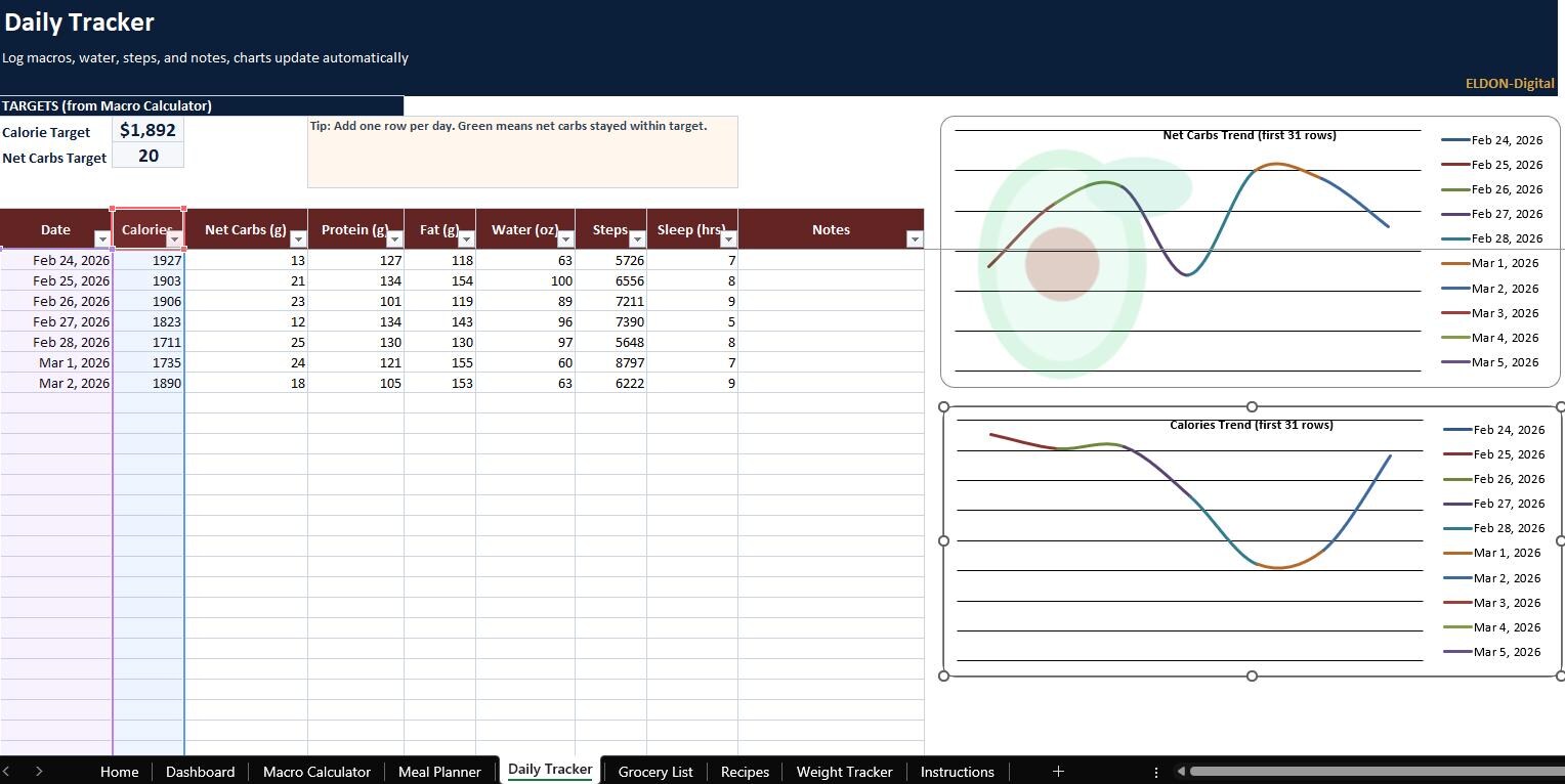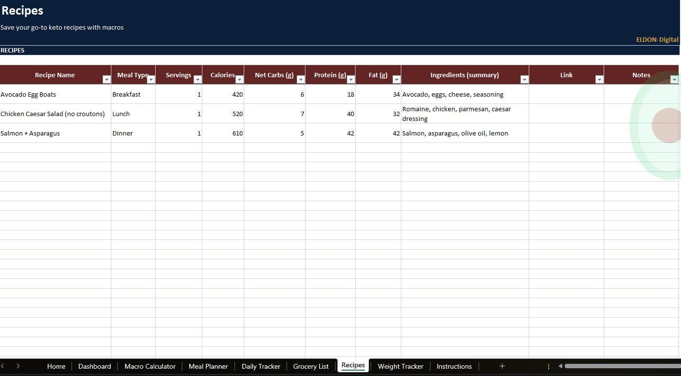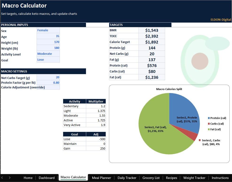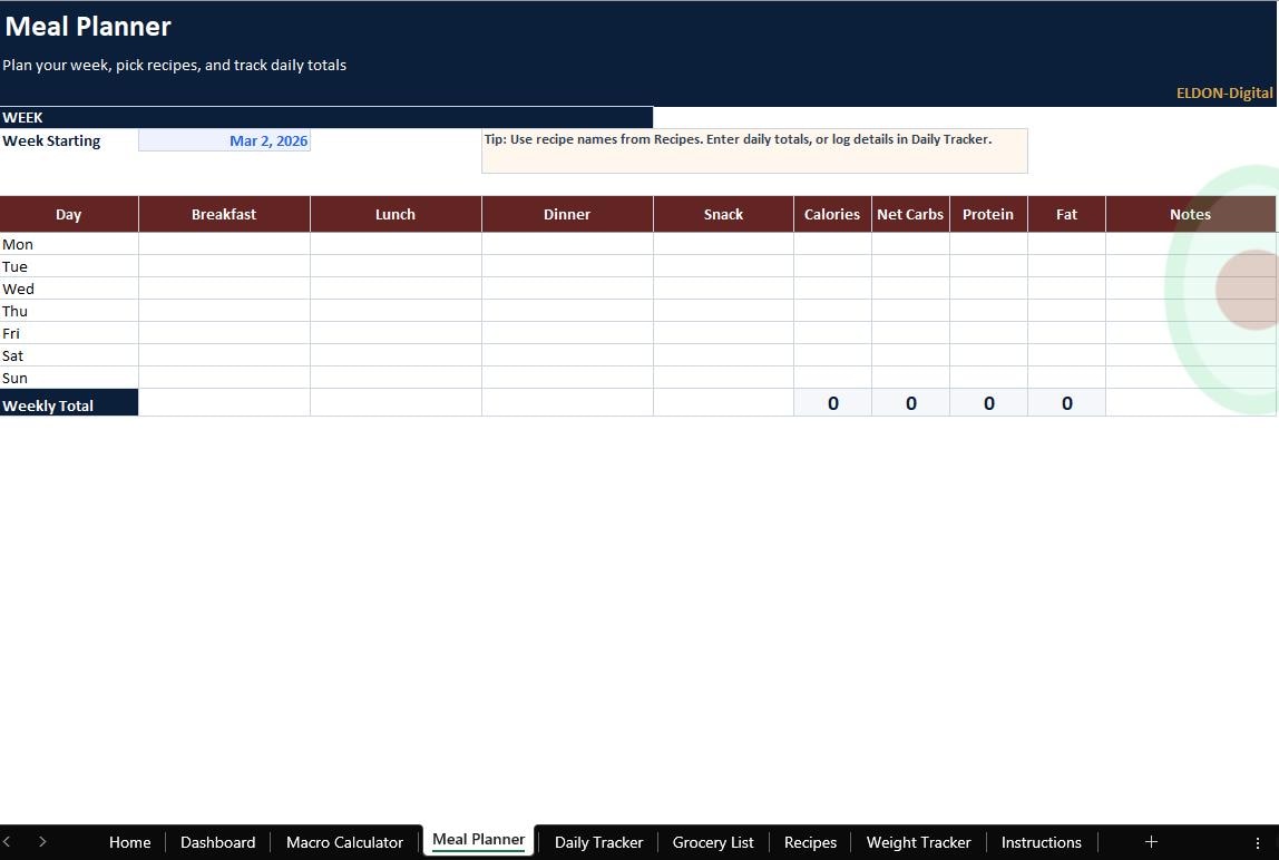Stay consistent on keto with a complete, easy-to-use Keto Diet Planner Spreadsheet by ELDON-Digital. This colorful planner works in Excel and can be imported into Google Sheets, and includes a clean dashboard with charts, a macro calculator, meal planning pages, grocery lists, recipes, and progress tracking. Designed with subtle background images for a premium Etsy look.