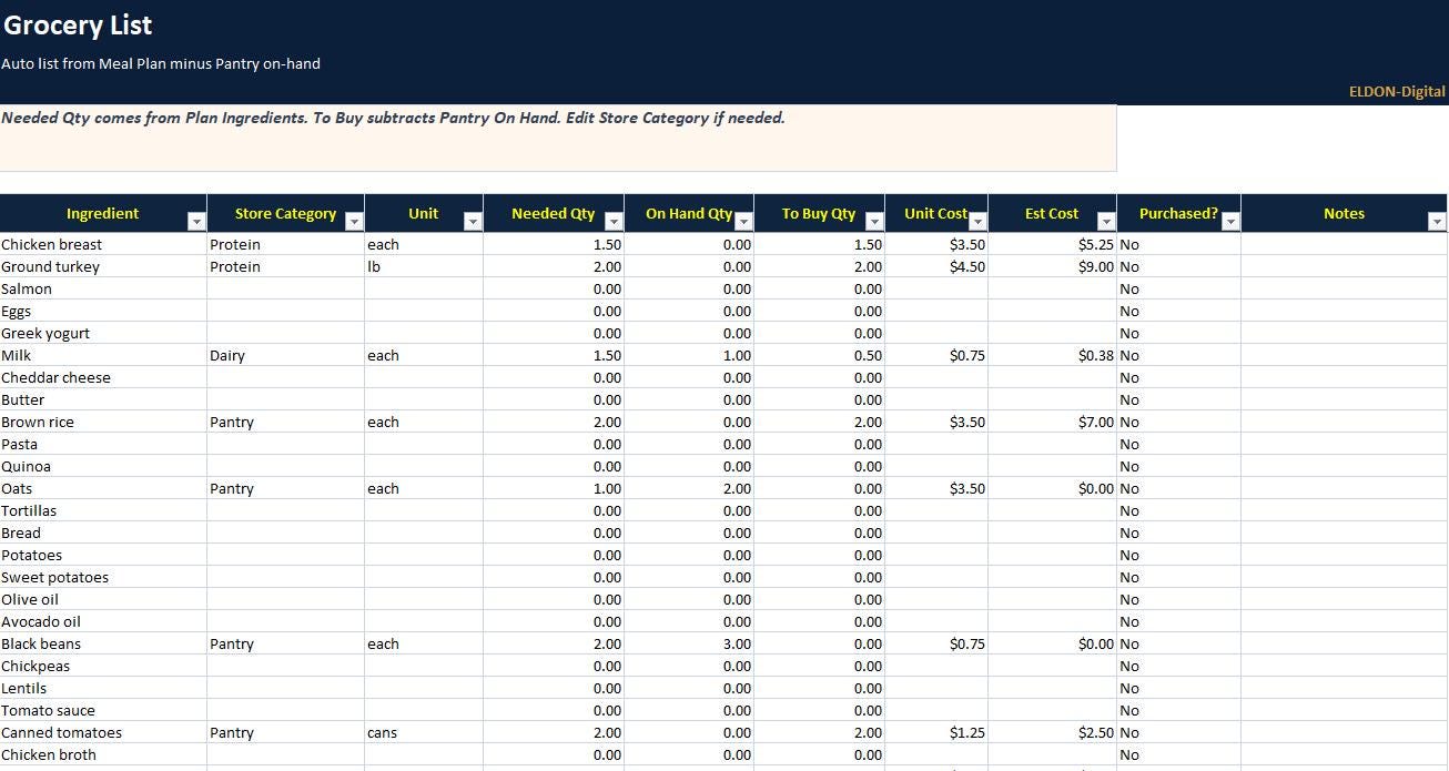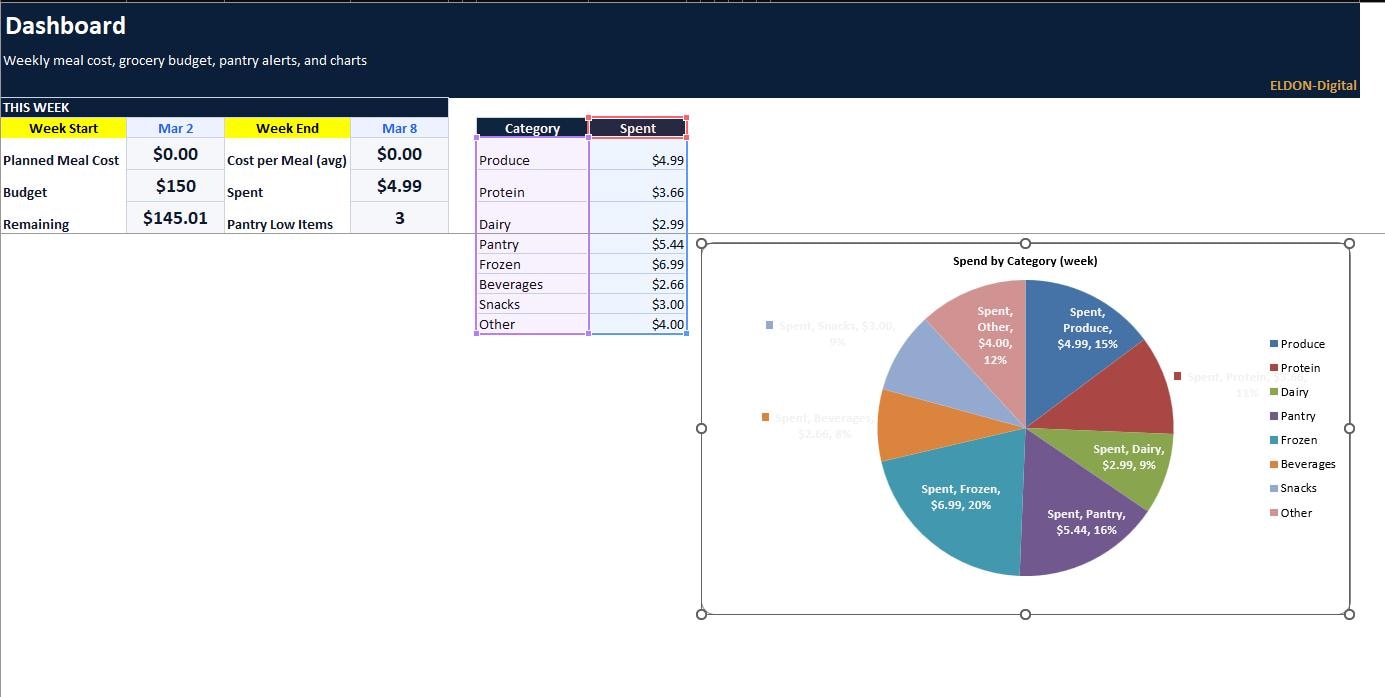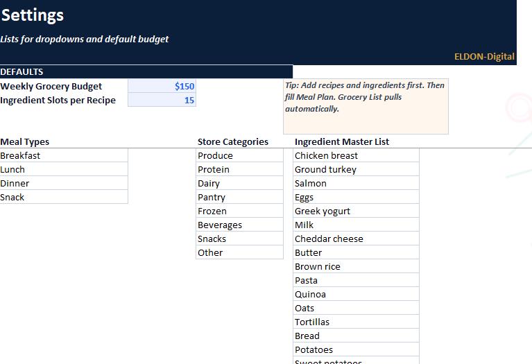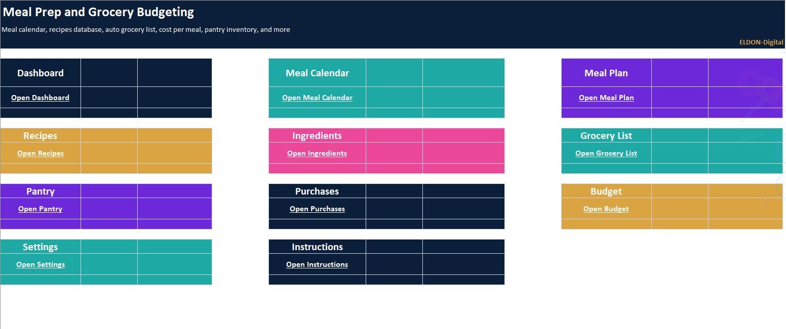 Plan meals, prep smarter, and control grocery spending with this complete Meal Prep and Grocery Budgeting Spreadsheet Program by ELDON-Digital. Built for Excel and easily imported into Google Sheets, this colorful system includes a meal calendar, recipe database, automatic grocery list, cost per meal calculator, pantry inventory, and a budget dashboard with charts. Designed with a simple button-style navigation layout and beautiful background images for a premium Etsy look.