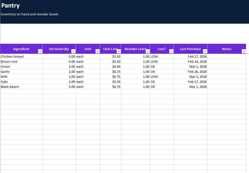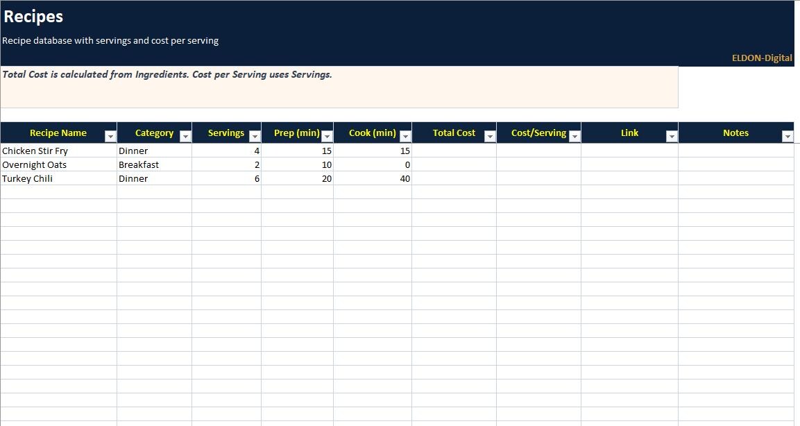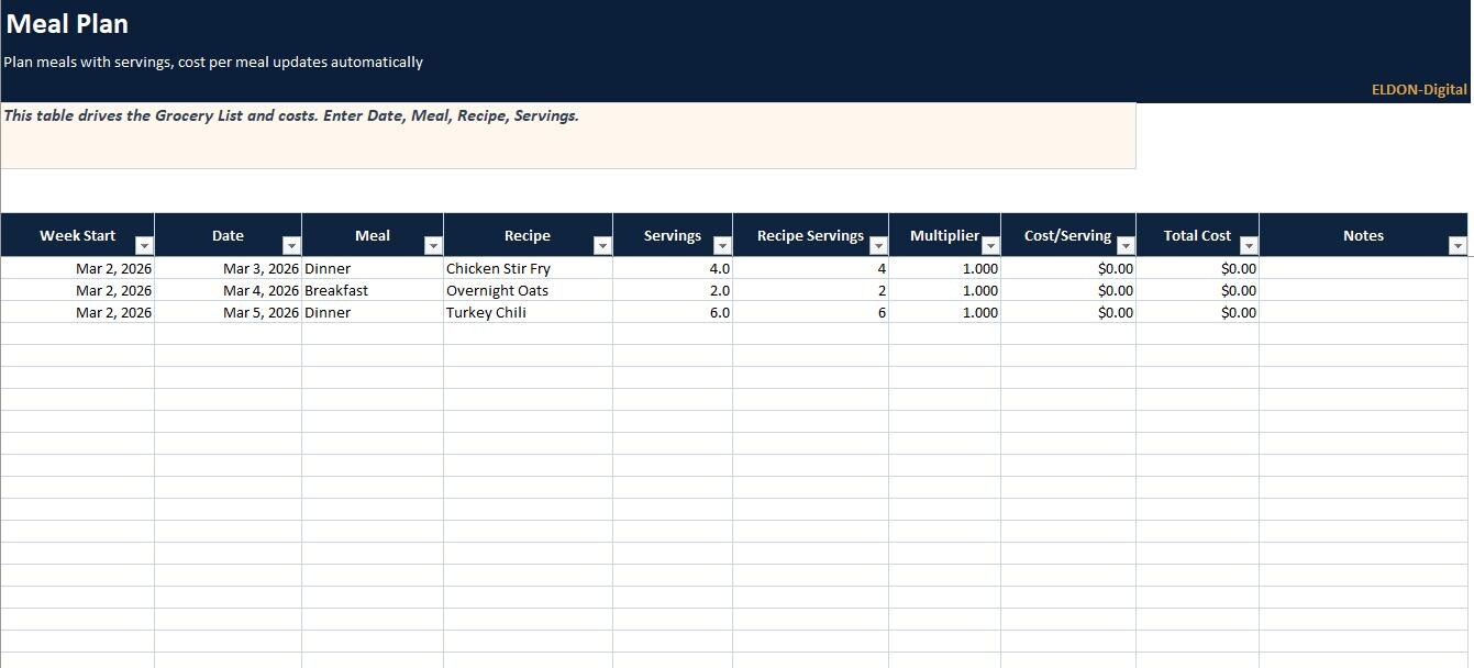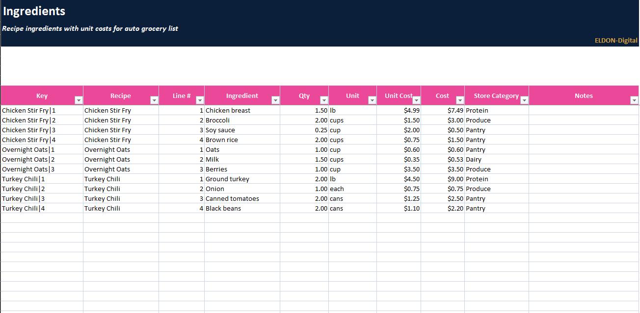 Plan meals, prep smarter, and control grocery spending with this complete Meal Prep and Grocery Budgeting Spreadsheet Program by ELDON-Digital. Built for Excel and easily imported into Google Sheets, this colorful system includes a meal calendar, recipe database, automatic grocery list, cost per meal calculator, pantry inventory, and a budget dashboard with charts. Designed with a simple button-style navigation layout and beautiful background images for a premium Etsy look.