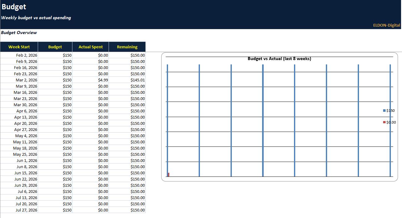 • Weekly budget vs actual dashboard