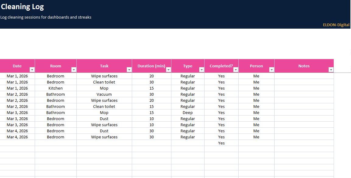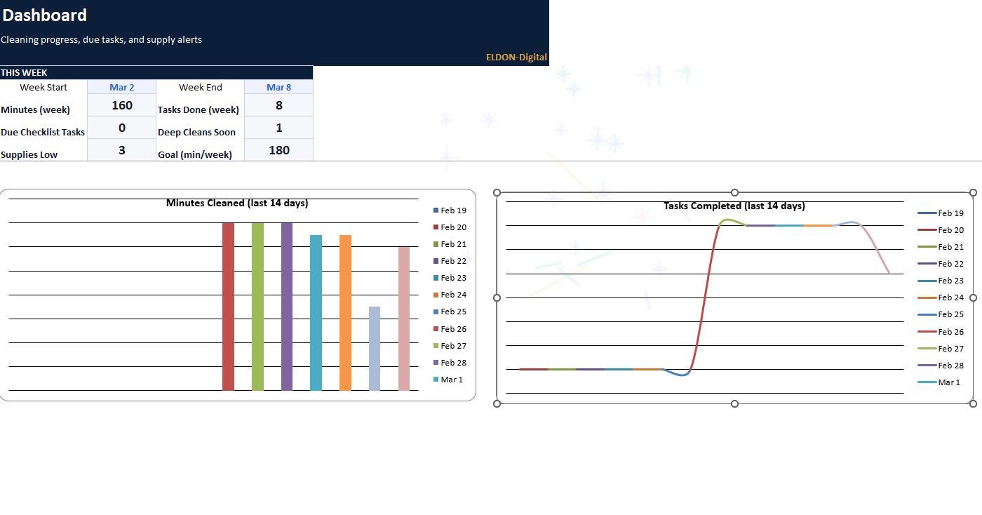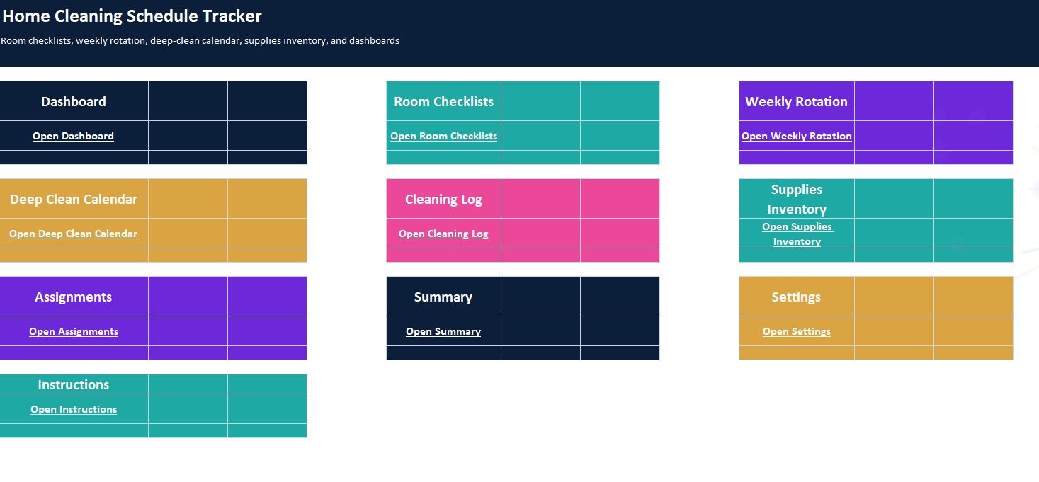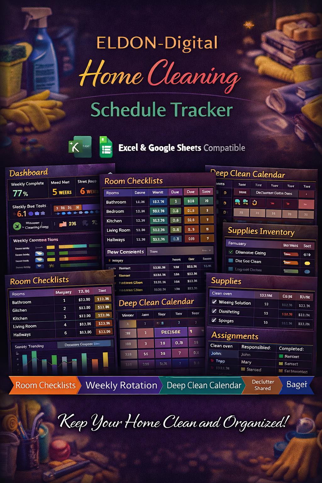 Keep your home clean without stress using this complete Home Cleaning Schedule Tracker Spreadsheet Program by ELDON-Digital. Built for Excel and easily imported into Google Sheets, this colorful system includes room-by-room checklists, a weekly rotation plan, a deep-clean calendar, a cleaning log, and a supplies inventory tracker, plus a dashboard with charts. Designed with a simple button-style navigation layout and beautiful background images for a premium Etsy look.