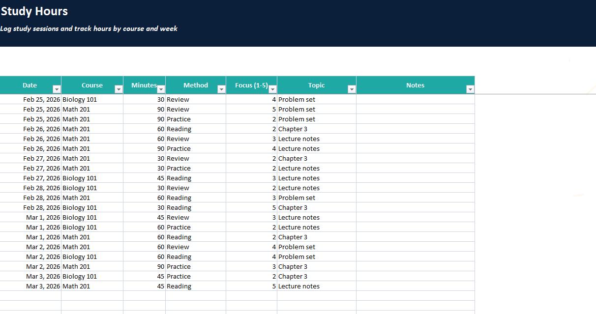 • Log study sessions by date, subject, duration, and method