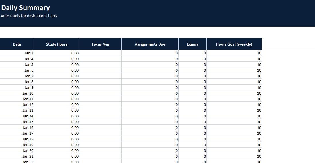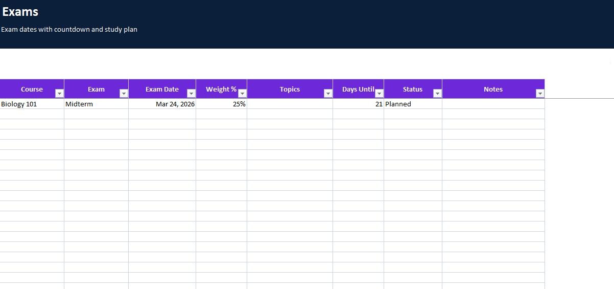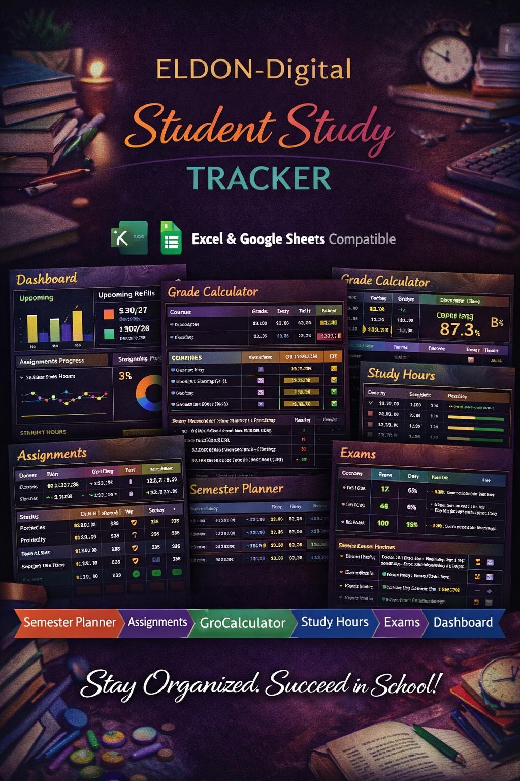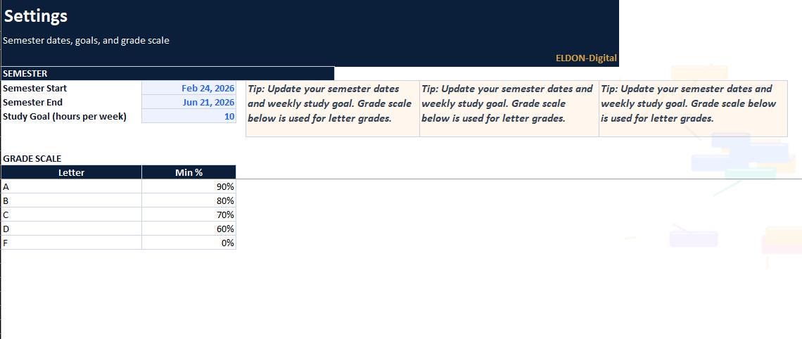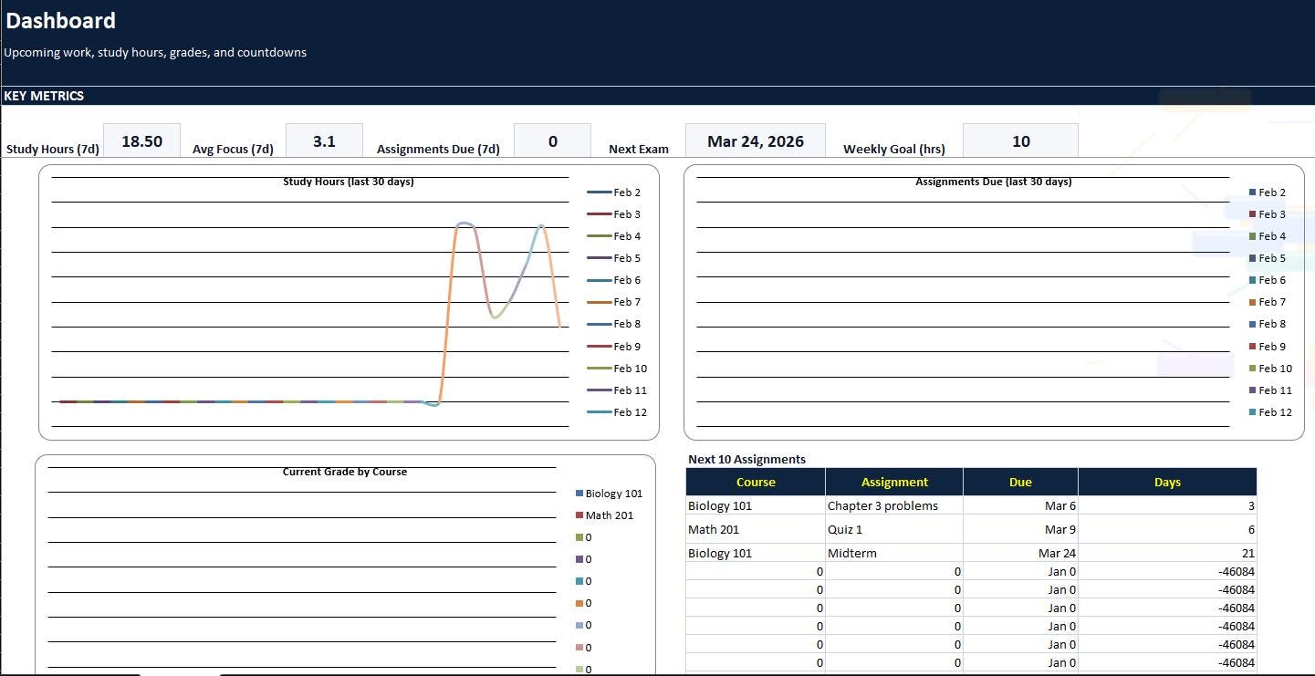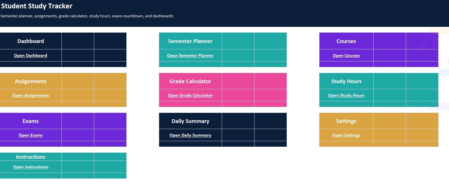Stay organized all semester with this complete Student Study Tracker Spreadsheet Program by ELDON-Digital. Built for Excel and easily imported into Google Sheets, this colorful system helps students manage a full semester schedule, track assignments and due dates, calculate grades automatically, log study hours, and monitor exam countdowns. Includes a dashboard with charts and a simple button-style navigation layout, plus beautiful background images for a premium Etsy look.