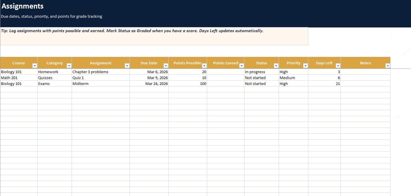 • Track assignments, due dates, priority, status, and days remaining