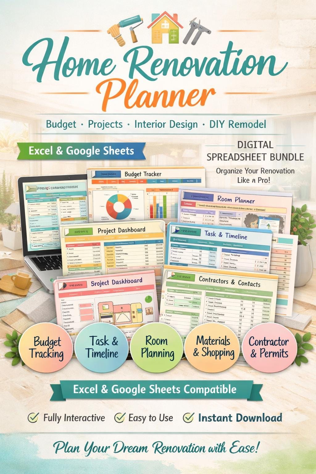 The ELDON-Digital Home Renovation Planner Spreadsheet Bundle is a complete, professionally designed planning system for homeowners, renovators, interior design lovers, DIY remodelers, and home project managers who want to stay organized from start to finish.