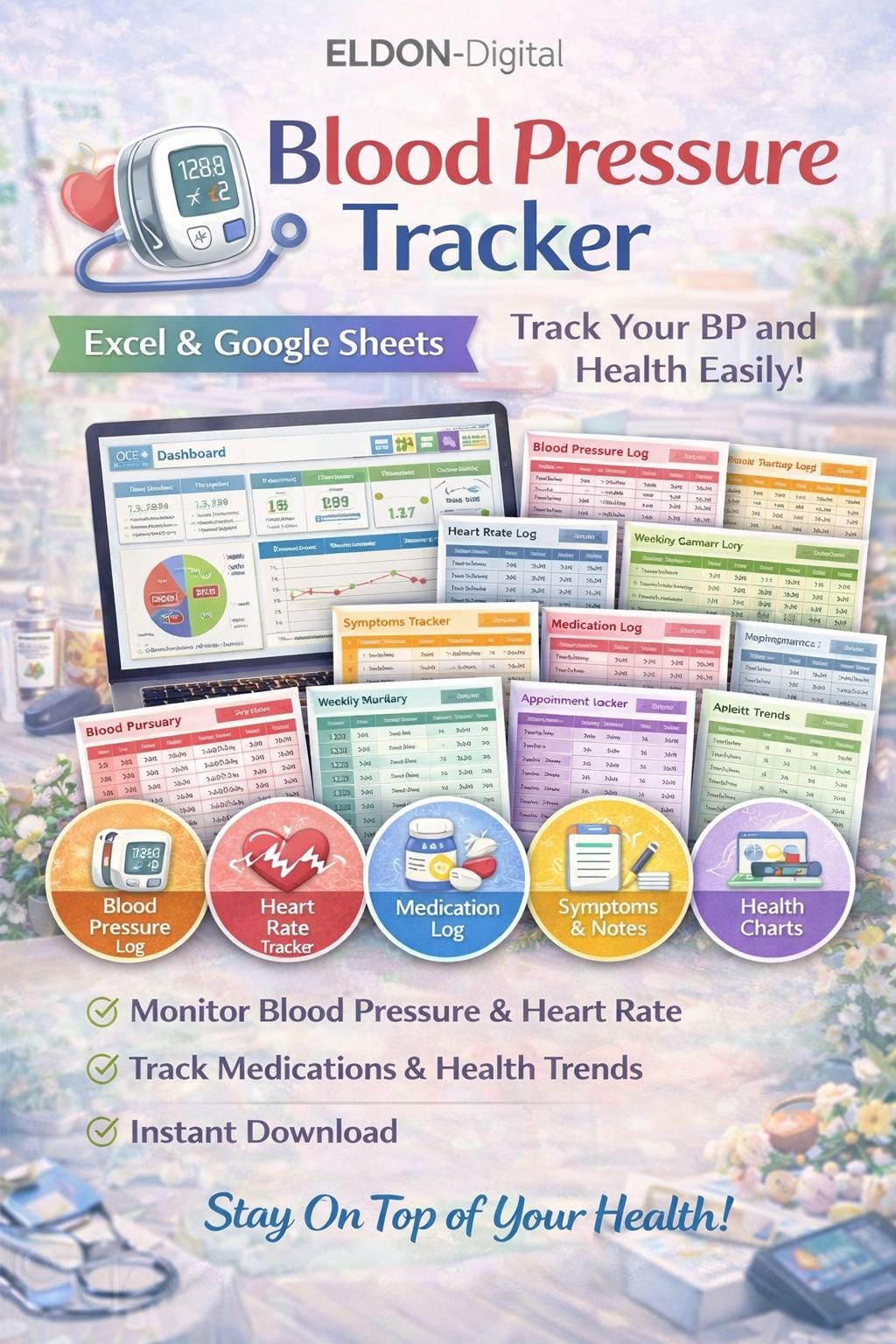 The ELDON-Digital Blood Pressure Tracker Spreadsheet is a complete and beautifully organized health tracking system designed to help you monitor blood pressure, heart rate, medications, symptoms, and medical trends in one easy-to-use dashboard.