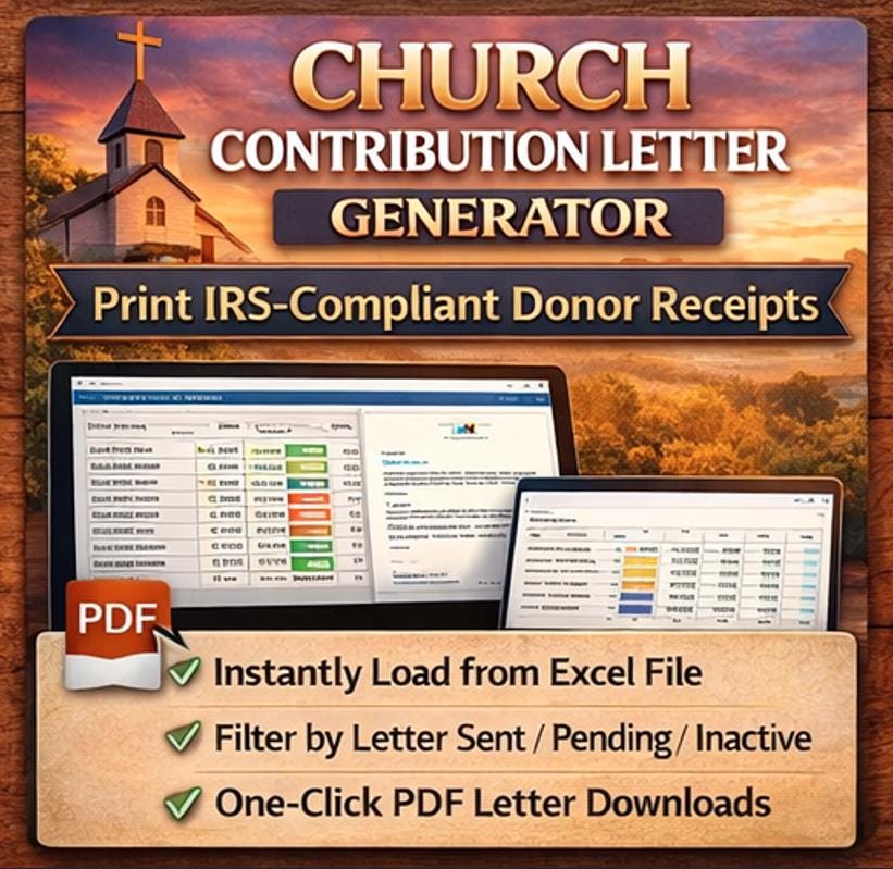 β¦ Professional letterhead auto-filled with your church name, address, EIN, pastor, and tax statements from your Settings sheet.
