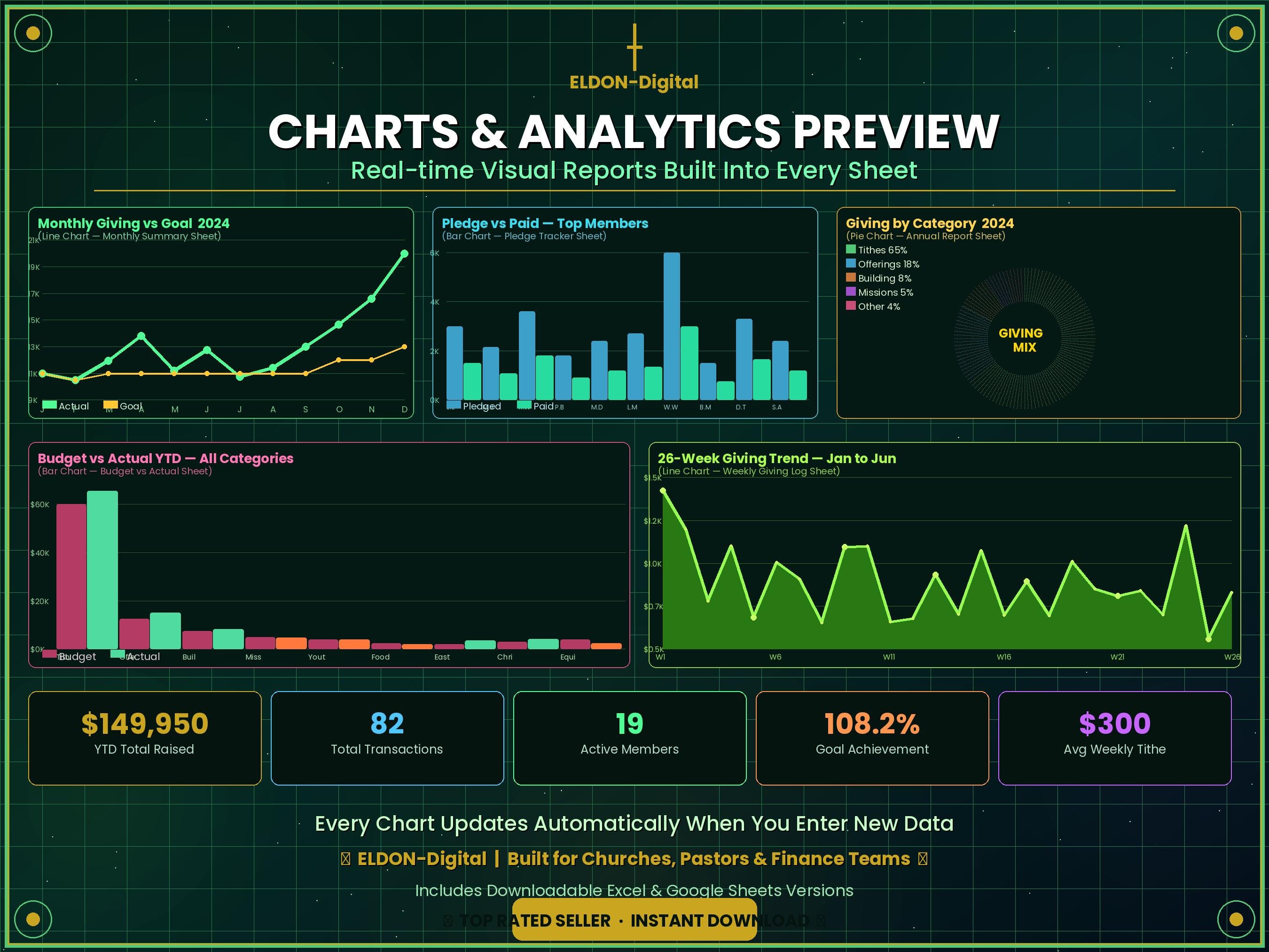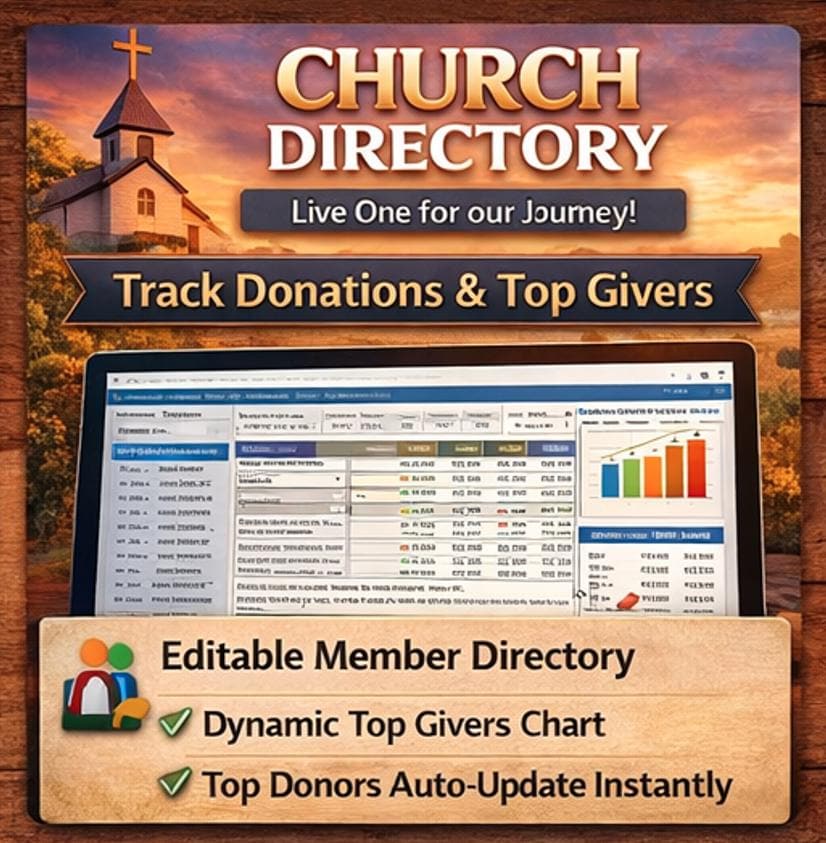 β¦ Member Directory - contact info, monthly giving averages, and a dynamic Top 8 Givers chart that updates automatically as data changes.