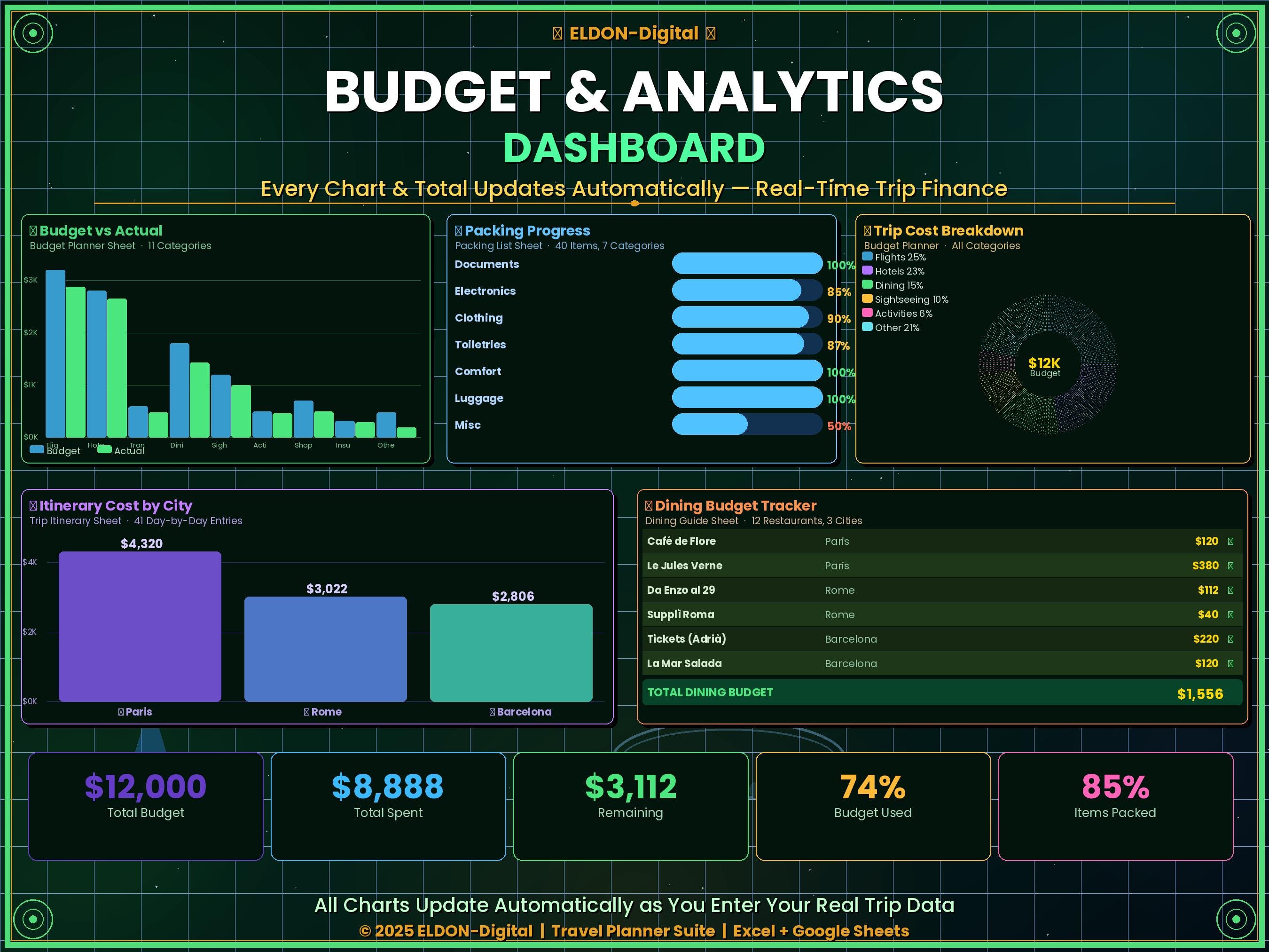 🌟 Everything in one file — no switching between 10 different apps or documents 🌟 Stunning visual design — dark, colorful, professional formatting that looks nothing like a boring spreadsheet 🌟 Color-coded by destination — each city gets its own row color in the itinerary so your trip is visually laid out at a glance 🌟 Status badges throughout — instantly see what's Confirmed ✅, Planned 🔵, or still Pending ⚠️ 🌟 One-click navigation — every sheet has a "⬅ BACK TO DASHBOARD" button so you're always in control 🌟 Fully editable — change destination names, budgets, dates, currencies, categories — anything you need 🌟 Print-ready layouts — clean, professional formatting that prints beautifully for travel binders or family trip packets 🌟 Works offline — perfect for areas with limited Wi-Fi. Download and use on your phone via the Google Sheets app