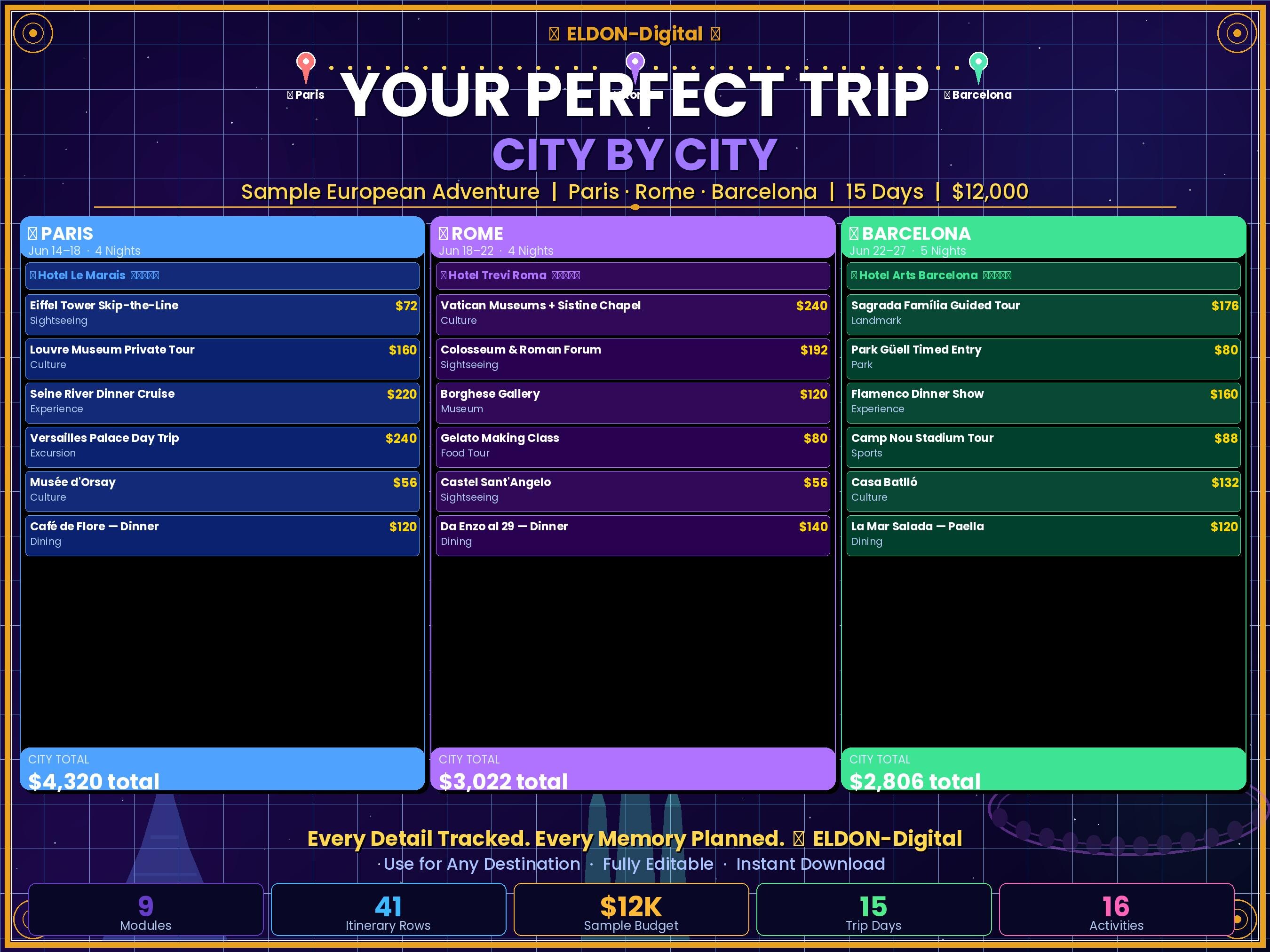 ✅ Pre-Filled with a Sample European Itinerary — Paris, Rome & Barcelona, 15 days, family of 4, $12,000 budget. See exactly how the finished planner looks before you customize it with your own trip details