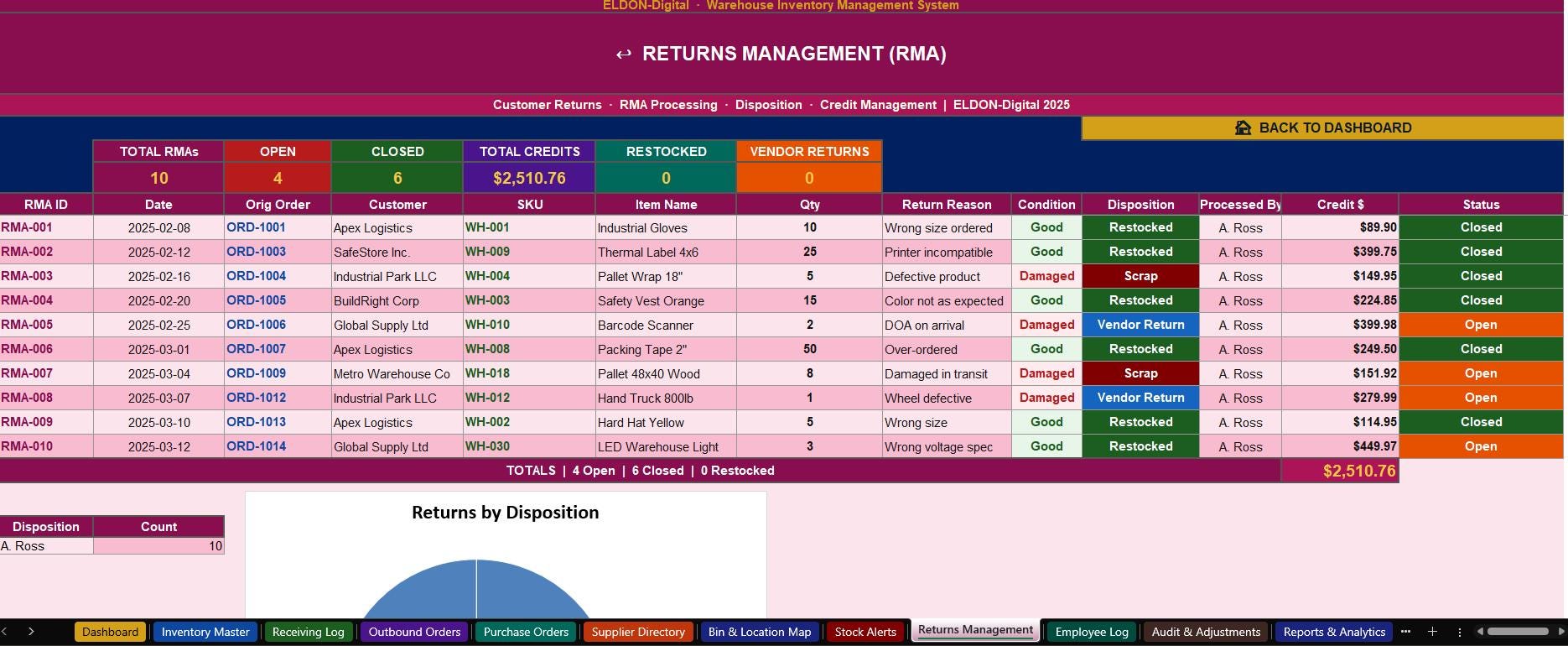 β©οΈ Returns Management (RMA) β Full return authorization log with Restocked / Vendor Return / Scrap dispositions, credit amounts, and open/closed status