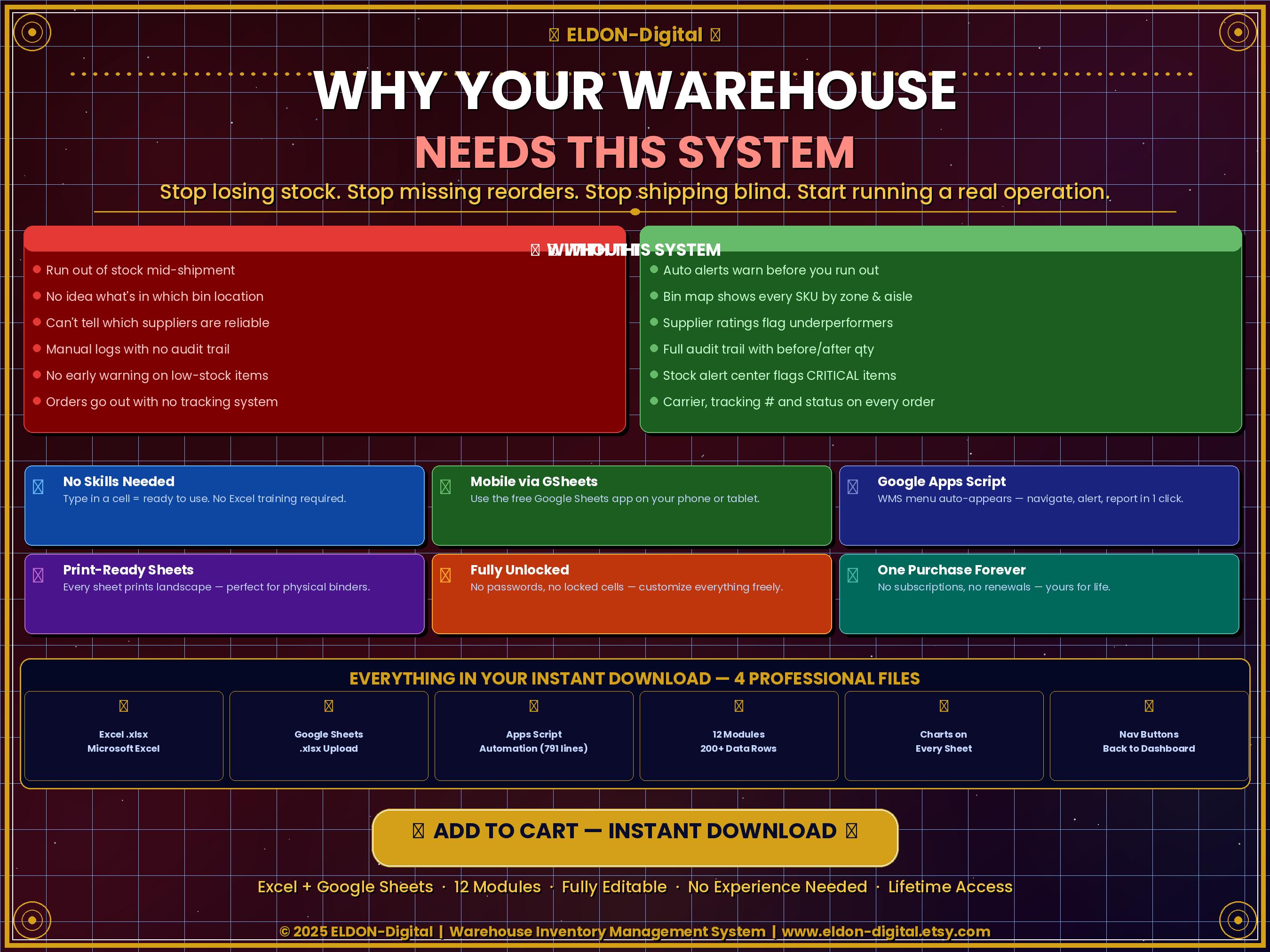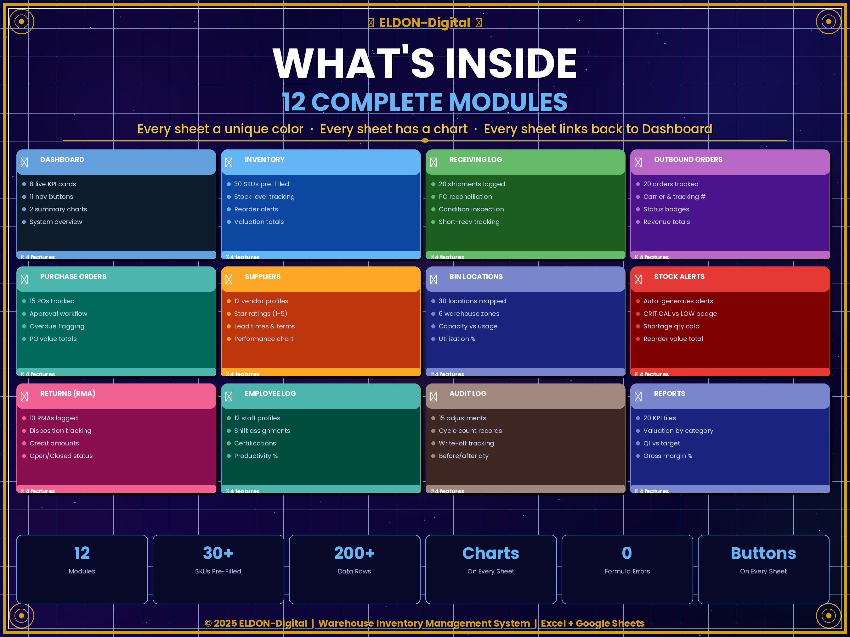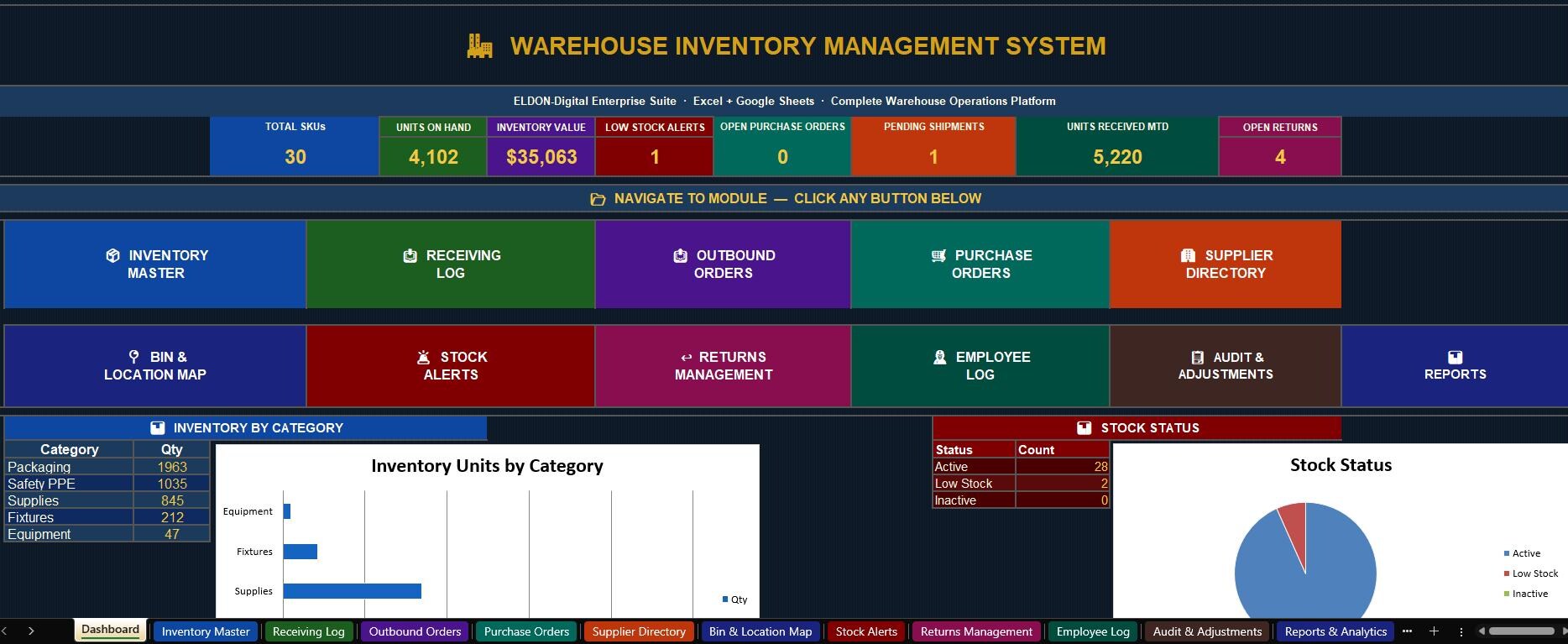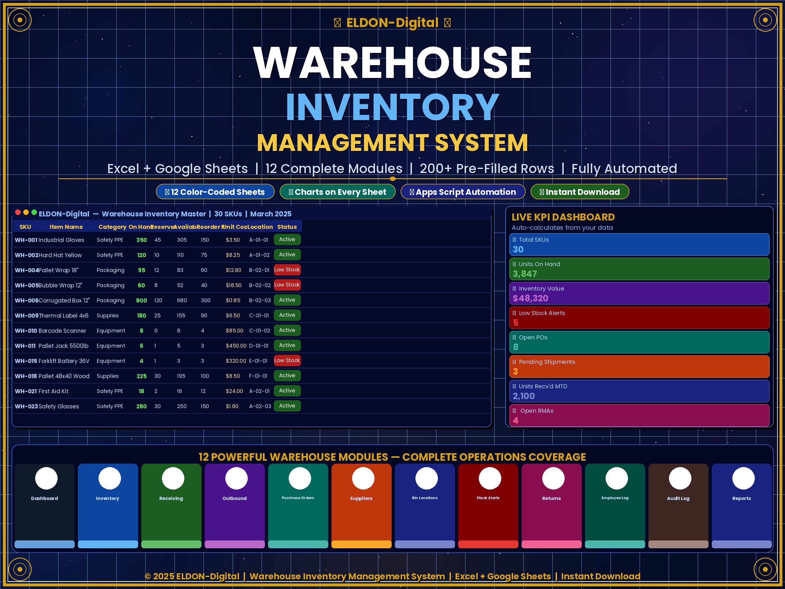 π ELDON-Digital | Warehouse Inventory Management System β Complete Bundle π Excel + Google Sheets | 12 Modules | 30 Pre-Filled SKUs | Fully Automated