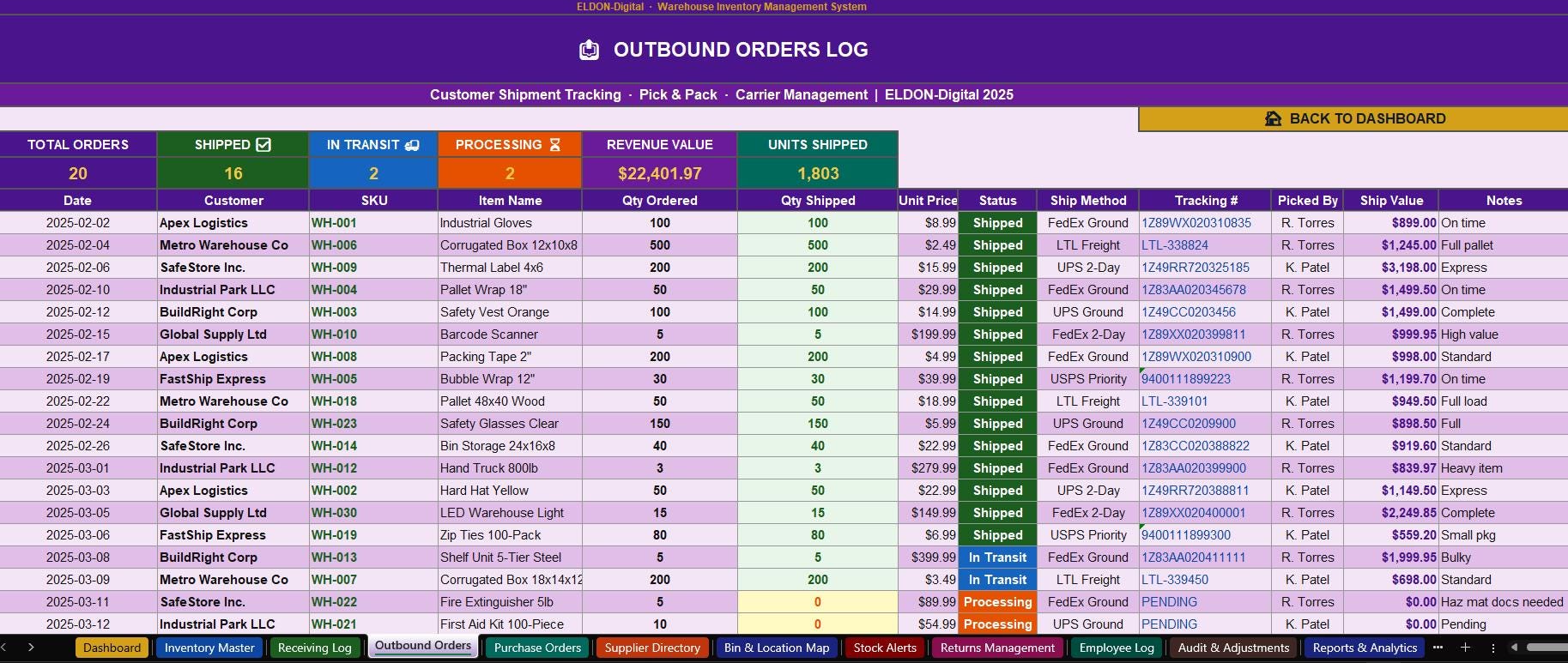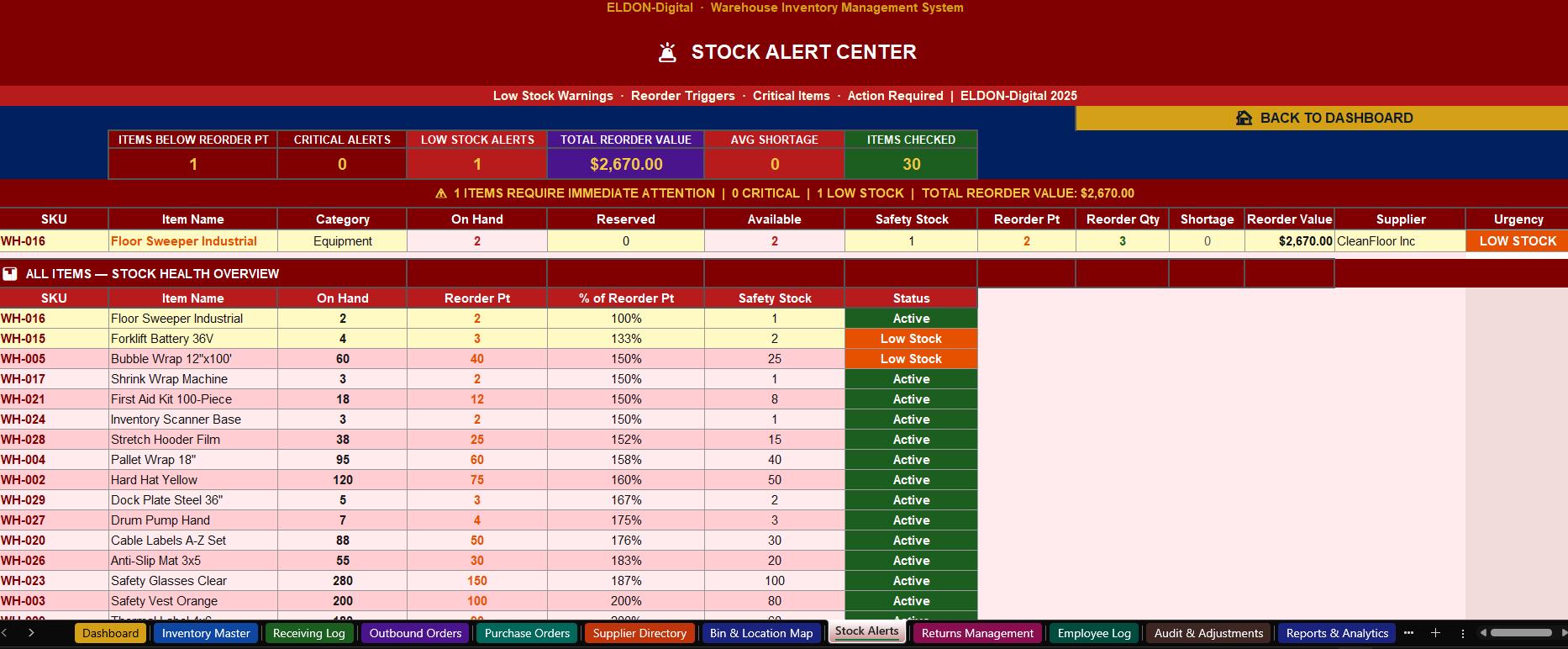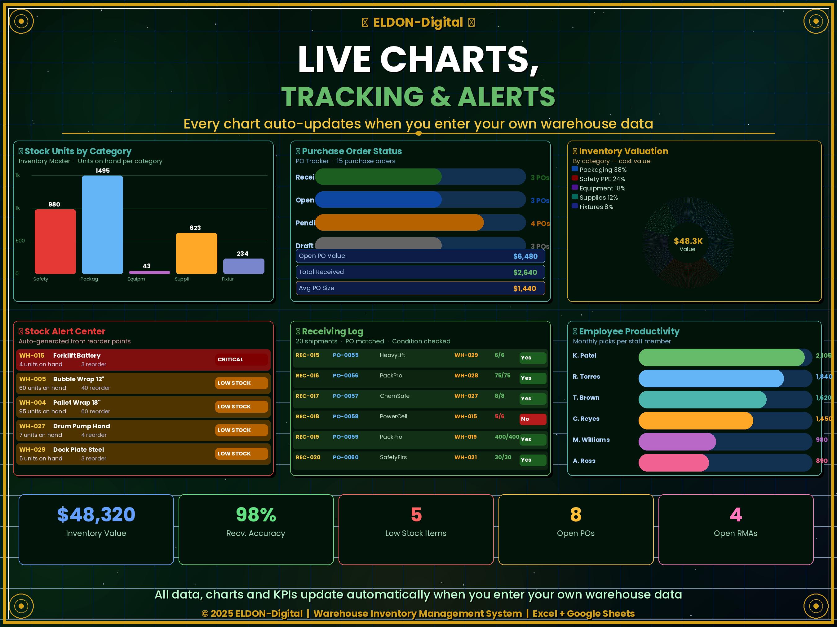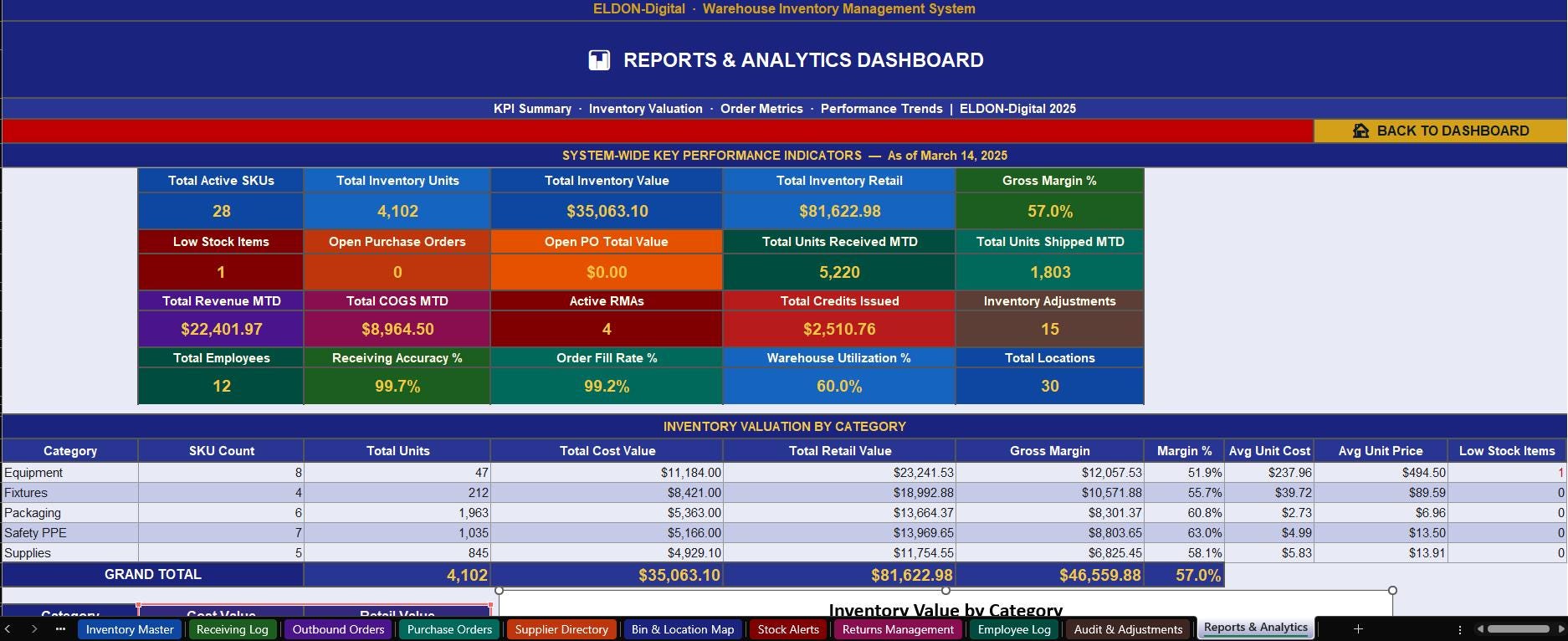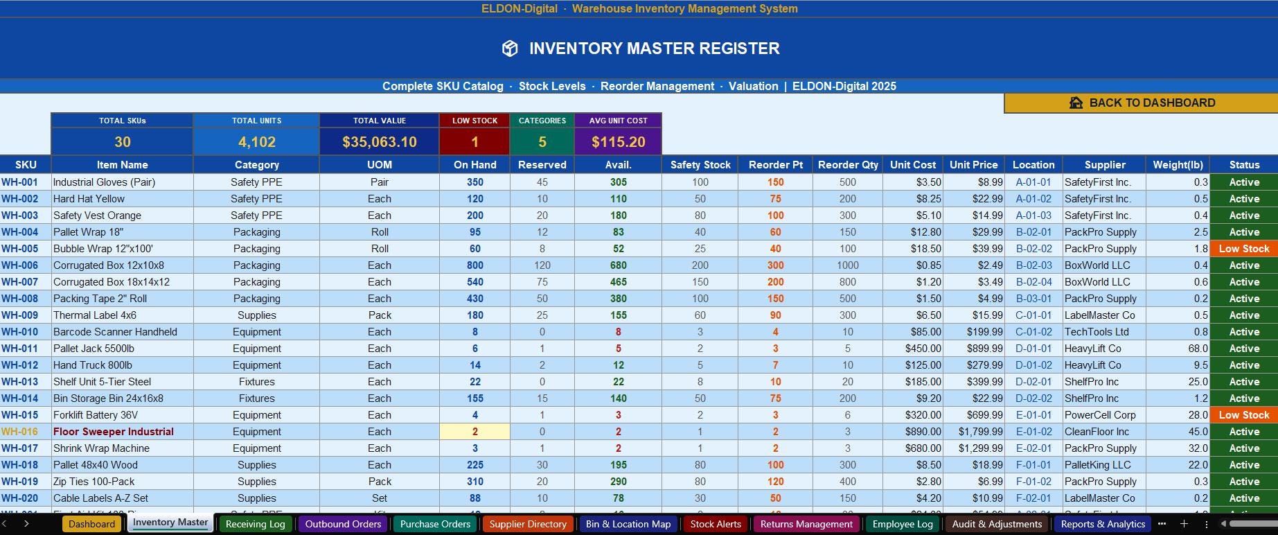 π ELDON-Digital | Warehouse Inventory Management System β Complete Bundle π Excel + Google Sheets | 12 Modules | 30 Pre-Filled SKUs | Fully Automated