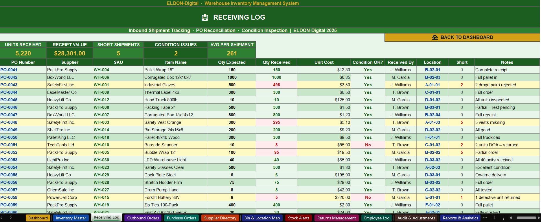 π₯ Receiving Log β Track every inbound shipment with PO reconciliation, quantity verification, condition inspection (Yes/No), short-shipment alerts, and receiving totals