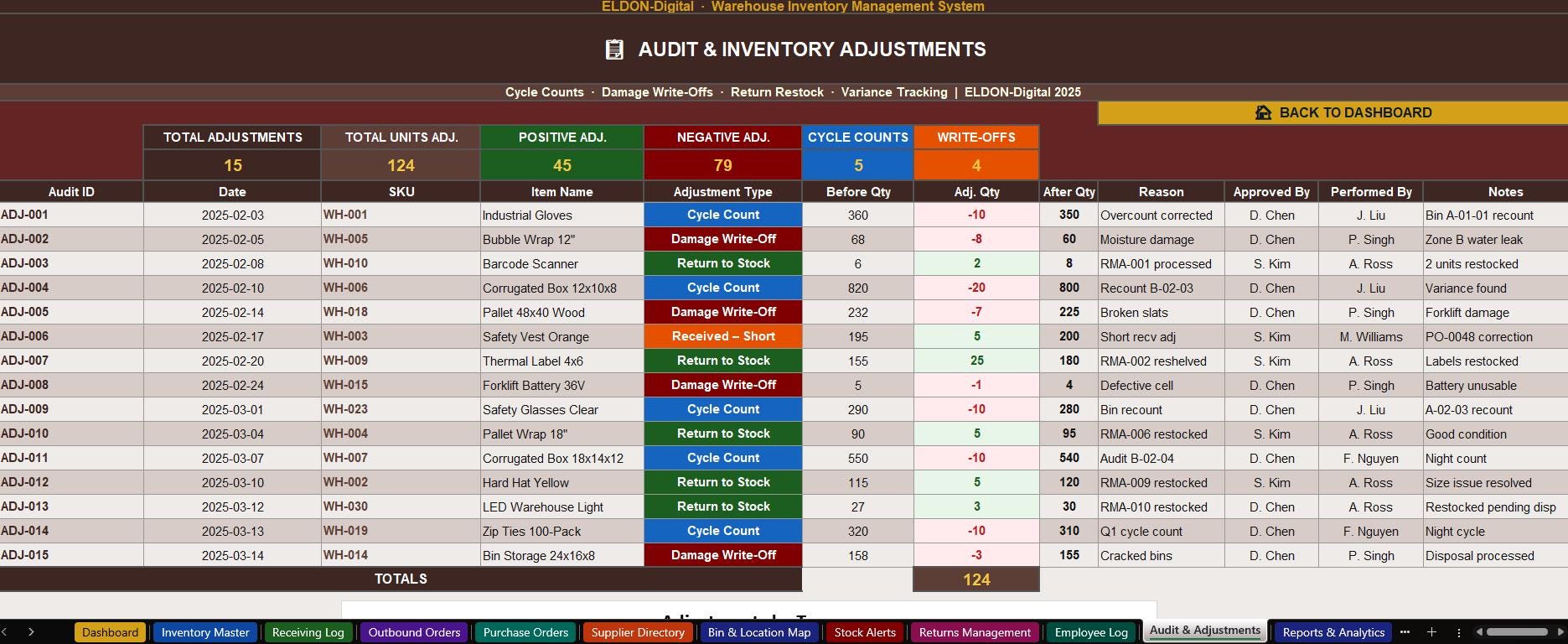 π Audit & Adjustments β Full inventory adjustment log covering cycle counts, damage write-offs, and return restocks β with before/after quantities and approver names