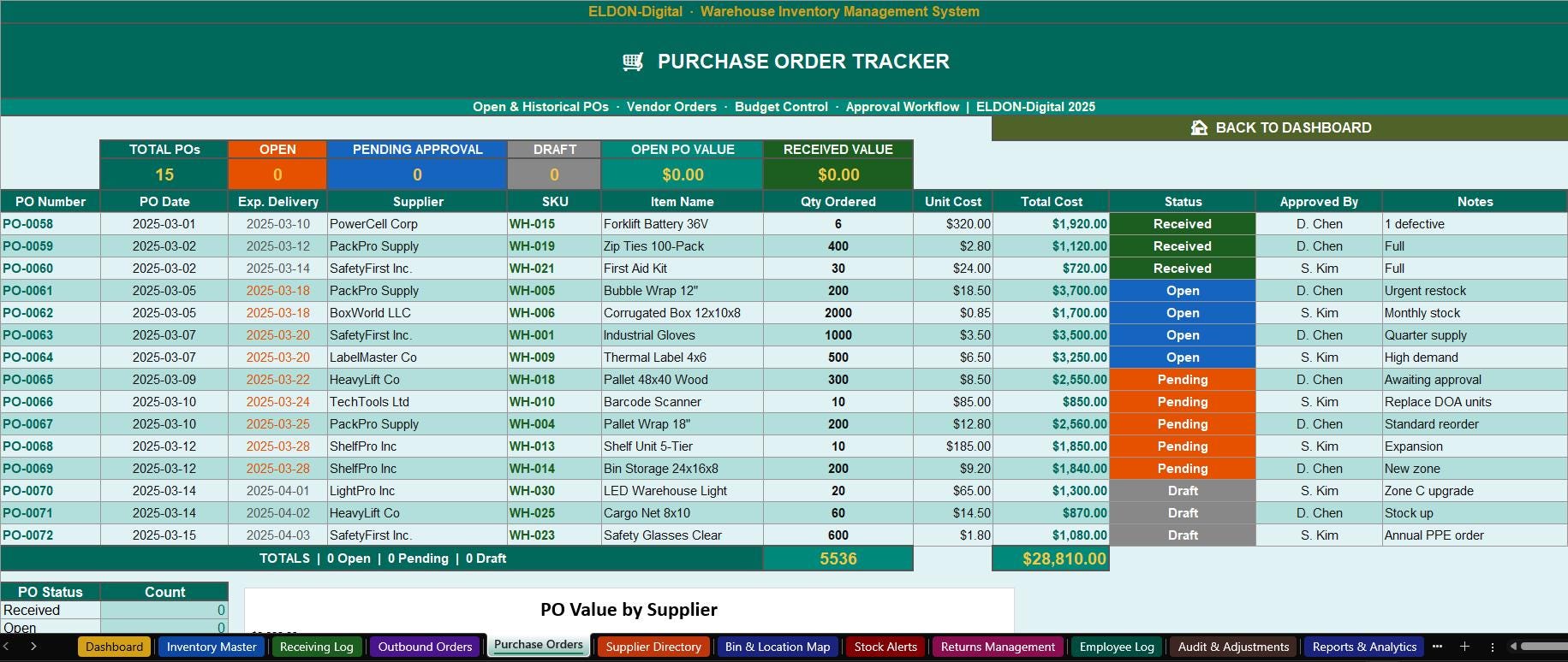 π Refresh All KPIs β recalculates dashboard counters instantly π¨ Scan Low Stock β highlights every item below its reorder point β° Flag Overdue POs β colors past-due purchase orders red automatically π₯ Log New Receipt β guided receipt entry that updates on-hand qty β