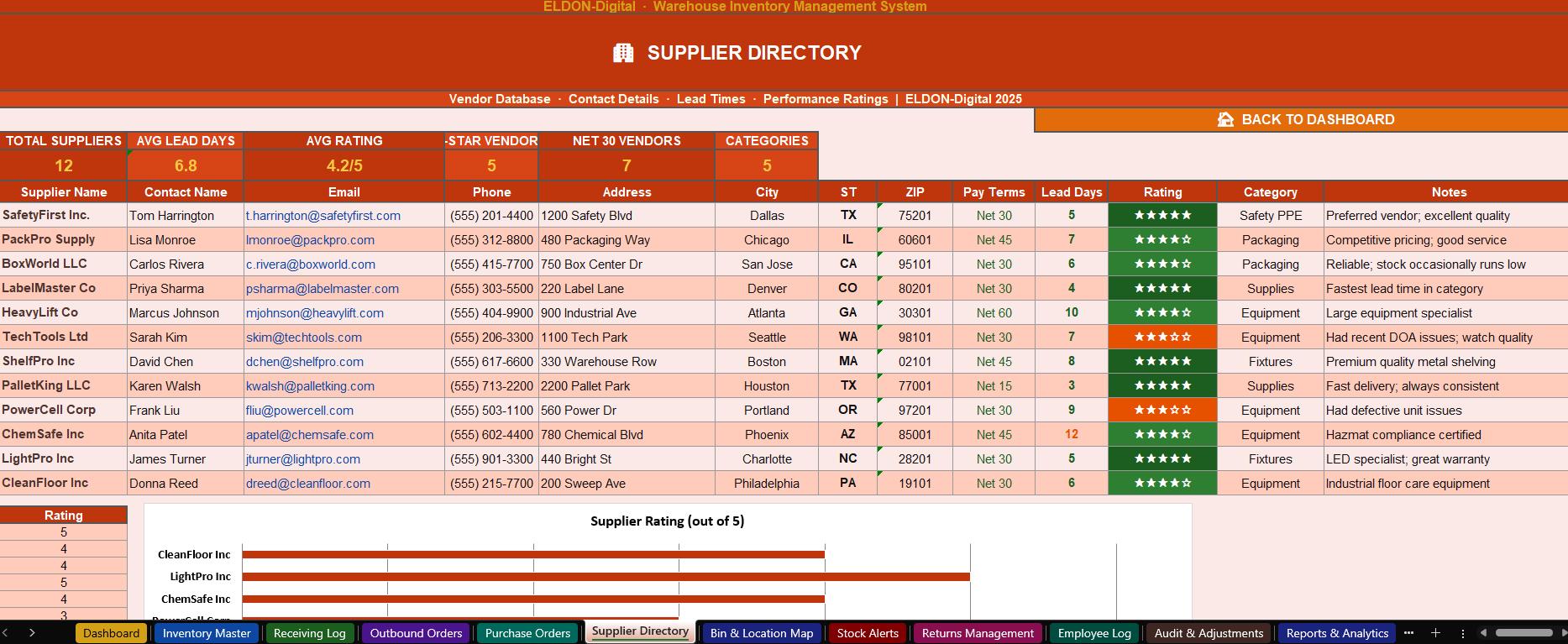π’ Supplier Directory β 12 vendor profiles with contact info, star performance ratings, lead times, payment terms, and a visual rating chart