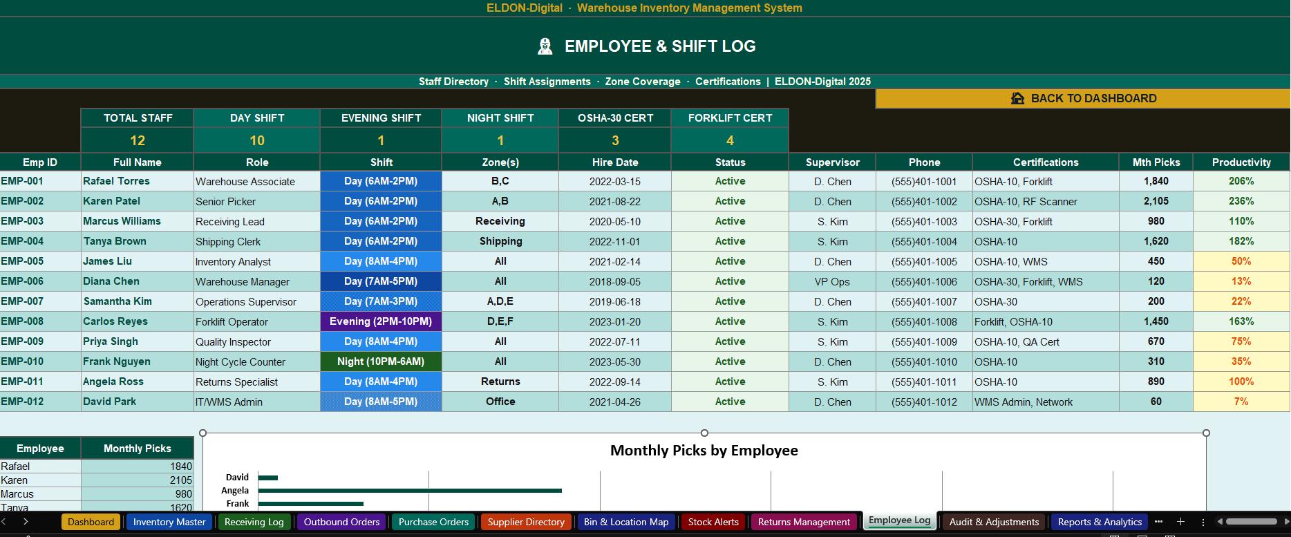 π· Employee Log β Staff directory with shift assignments, zone coverage, certifications (OSHA-10, OSHA-30, Forklift), and monthly pick productivity tracking