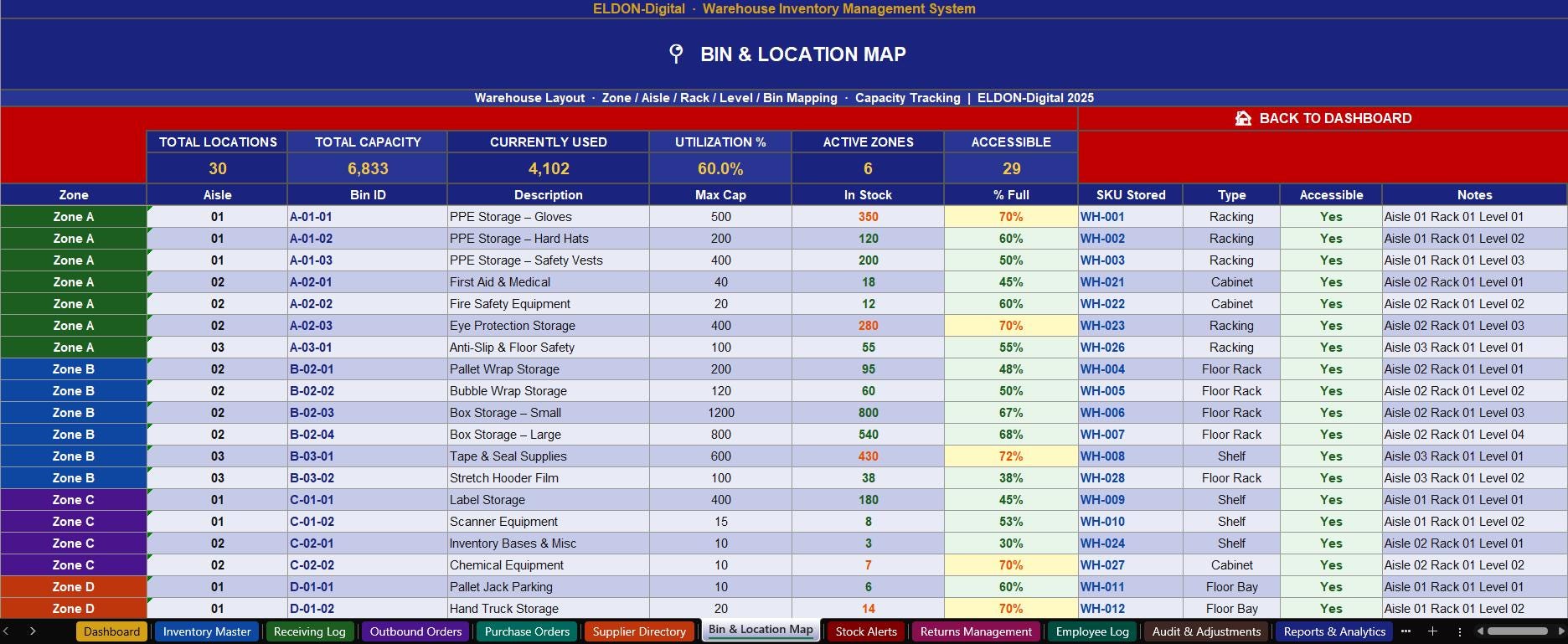 π Bin & Location Map β Zone-by-zone warehouse location tracker (Zones AβF, 30 locations) with capacity vs. current usage and utilization percentage