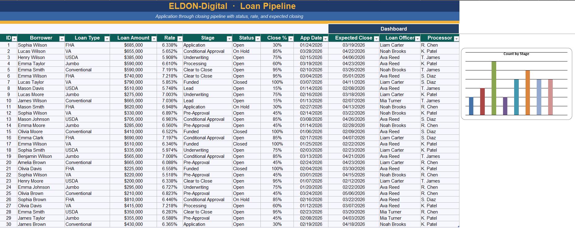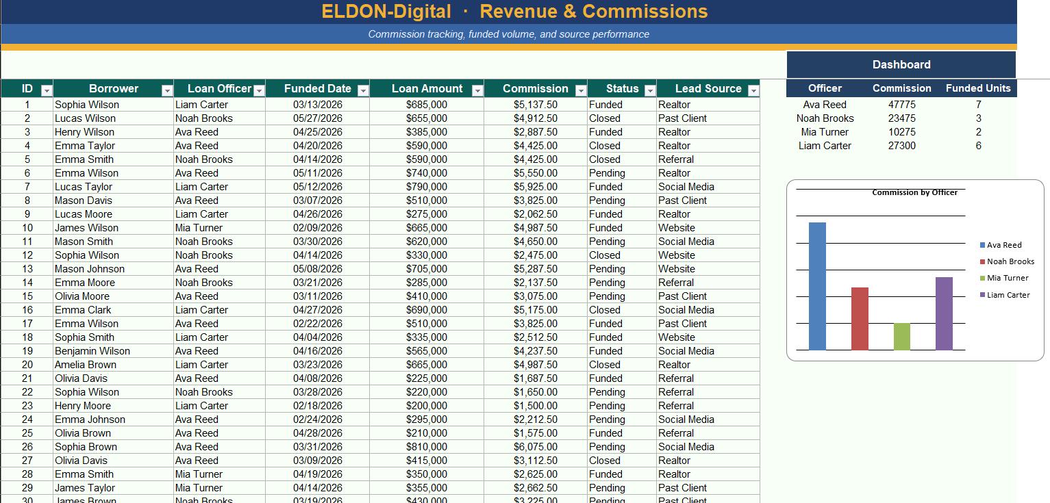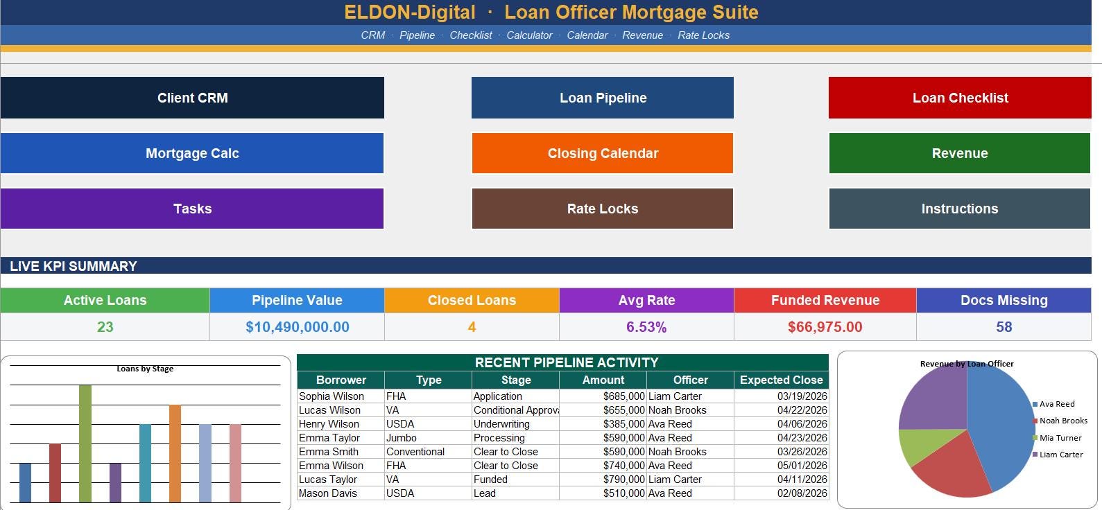 This professionally designed Loan Officer Spreadsheet Bundle for Excel & Google Sheets is perfect for loan officers, mortgage brokers, mortgage teams, real estate finance professionals, and small business owners who want a polished, easy-to-use system for tracking leads, clients, loan stages, tasks, documents, deadlines, and commissions in one place.