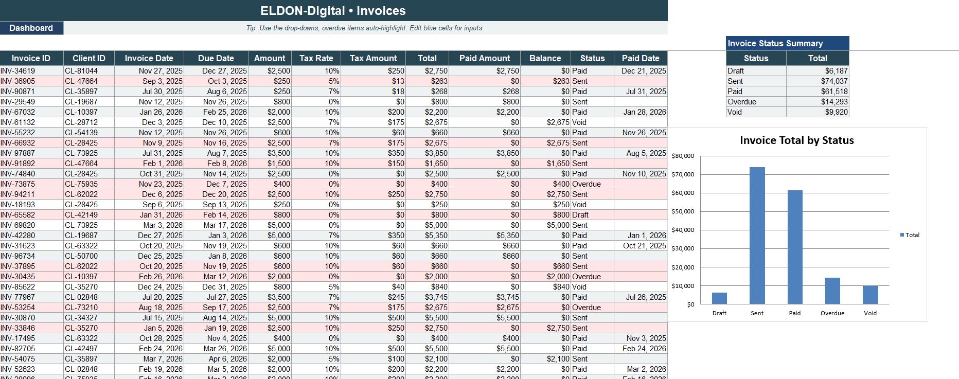 Track invoices, payment status, balances, due dates, and revenue with formulas that are built to work smoothly.