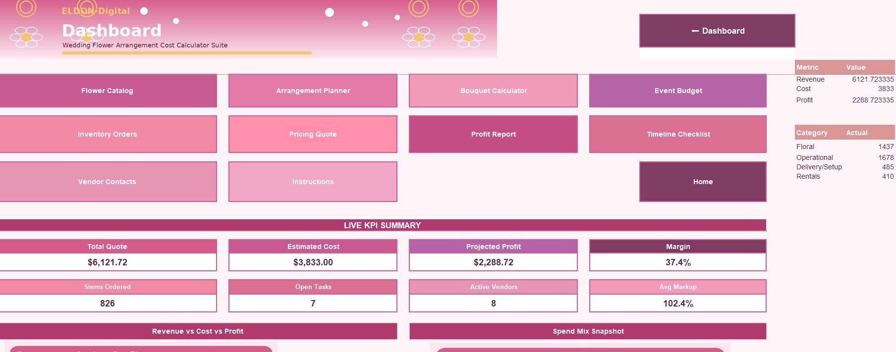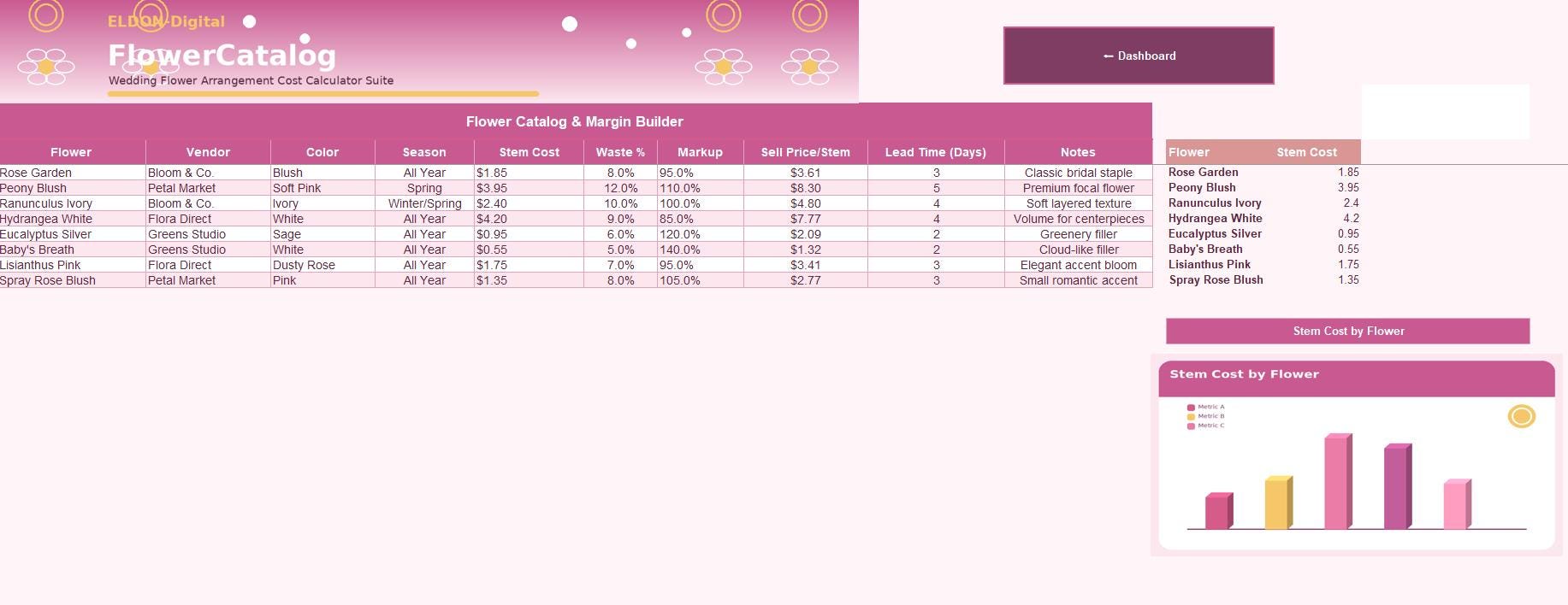This elegant pink and rose themed spreadsheet bundle is designed for Excel and Google Sheets and helps you organize floral planning, calculate bouquet and arrangement costs, estimate quotes, manage inventory, and track profit in one easy system.
