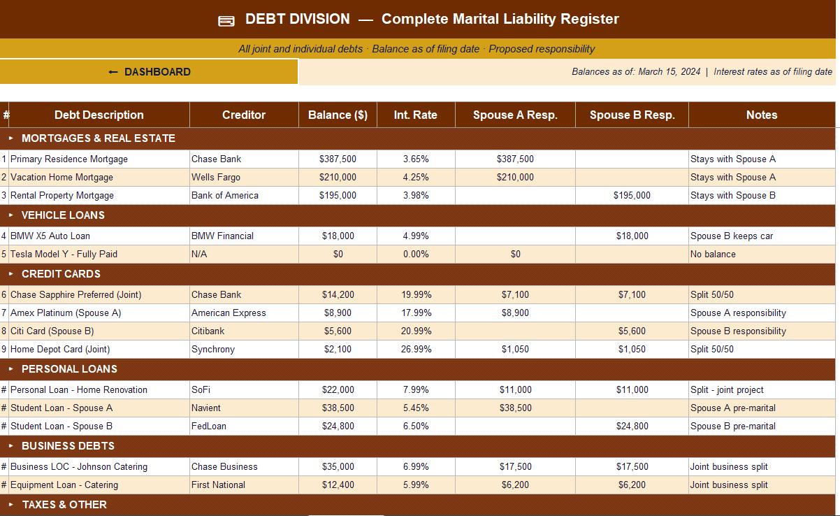 💳 Debt Division - Organize all marital liabilities across 17 categories with responsibility split by spouse