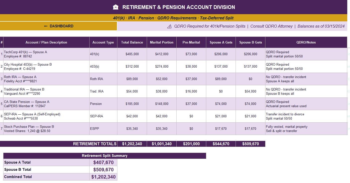 🏦 Retirement Accounts - Track 401(k), IRA, pension, and 403(b) accounts with marital vs. pre-marital split calculations and QDRO requirement flags