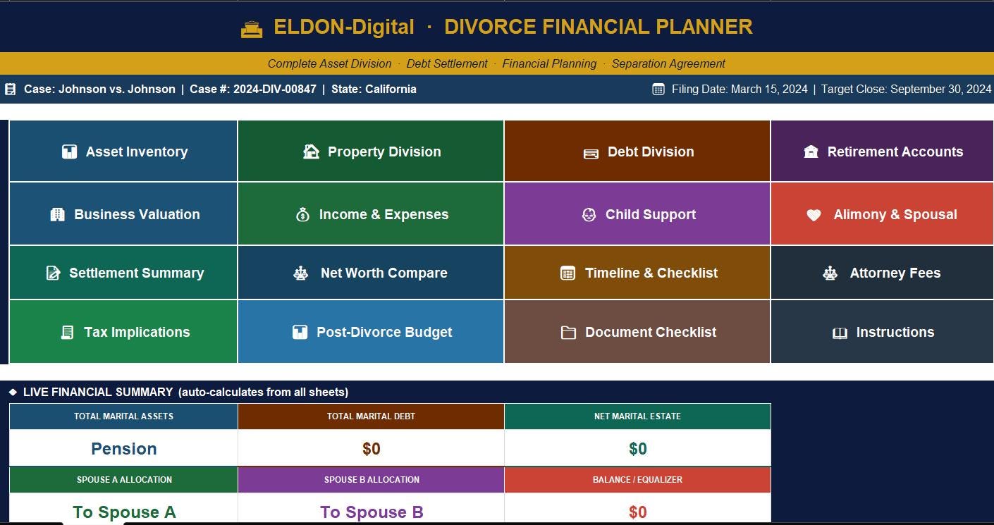 Going through a divorce is overwhelming - but your finances don't have to be. The ELDON-Digital Divorce Financial Planner is a comprehensive, professional-grade spreadsheet system built to help you organize every dollar, asset, and obligation involved in your divorce - all in one place. ✅