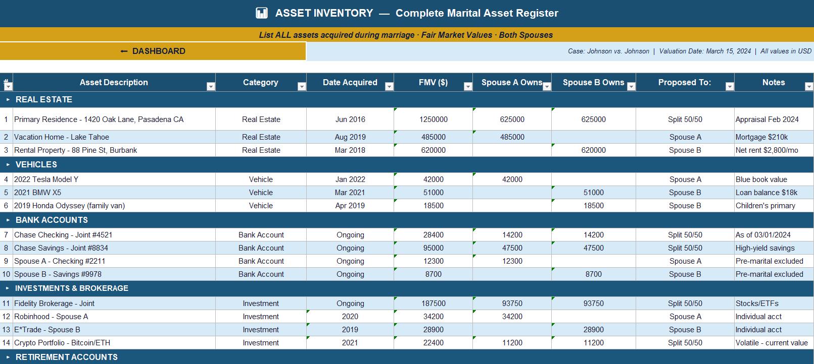 📋 Asset Inventory - Track all marital assets including real estate, bank accounts, vehicles, investments, business interests, and personal property with automatic FMV totals