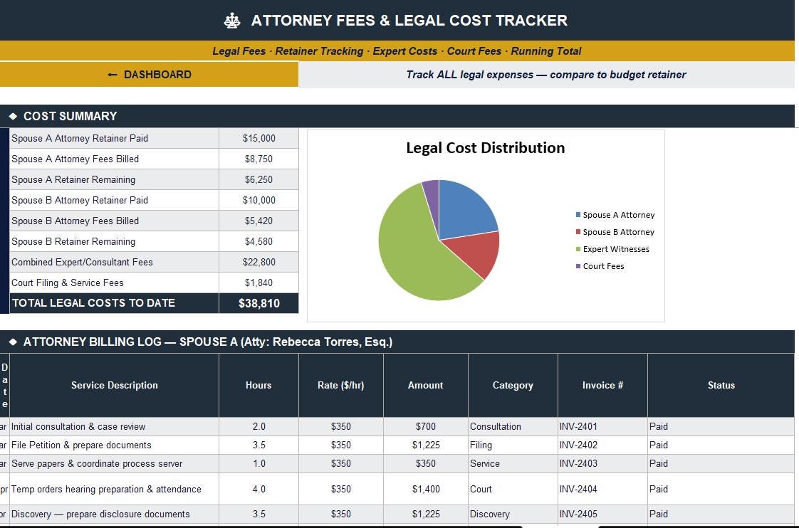 ⚖️ Attorney Fees Tracker - Full billing log, retainer tracking, expert witness costs, and court fee register