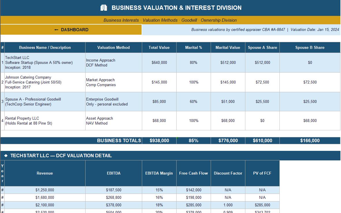 🏢 Business Valuation - DCF valuation table, goodwill analysis, revenue trends, and marital percentage calculator for business interests
