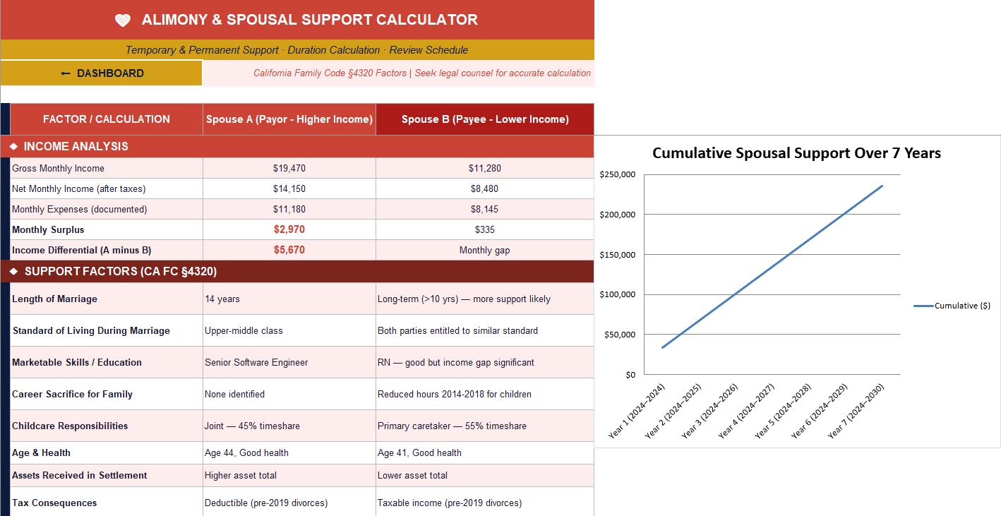 ❤️ Alimony & Spousal Support - Full CA §4320 factor analysis, duration calculator, and 7-year cumulative payment schedule