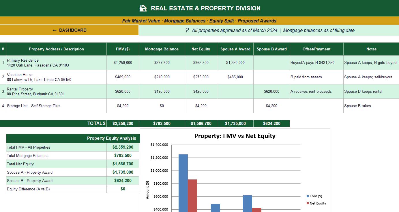 🏠 Property Division - Calculate net equity on up to 10 properties with automatic buyout calculations and visual bar charts