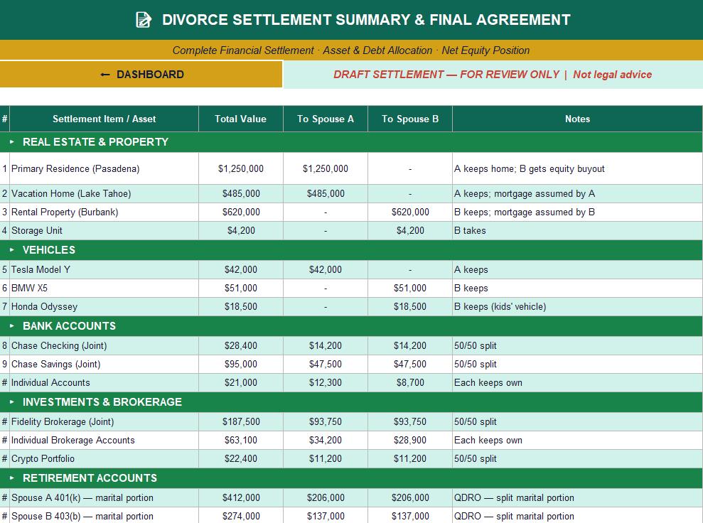 1️⃣ Download the file instantly after purchase 2️⃣ Open in Excel (2016, 2019, 2021, or Microsoft 365) or upload the HTML to Google Sheets 3️⃣ Replace the sample Johnson vs. Johnson data with your own information 4️⃣ Start from the Dashboard and navigate to any sheet using the gold buttons 5️⃣ Watch the Settlement Summary auto-calculate as you enter your data